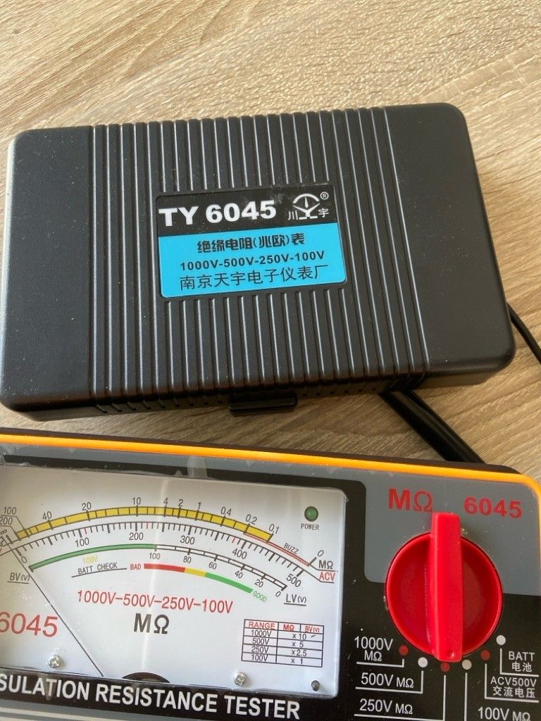 TY 6045 insulation resistance tester. Measures MΩ and ACV. Ranges 100V-1000V