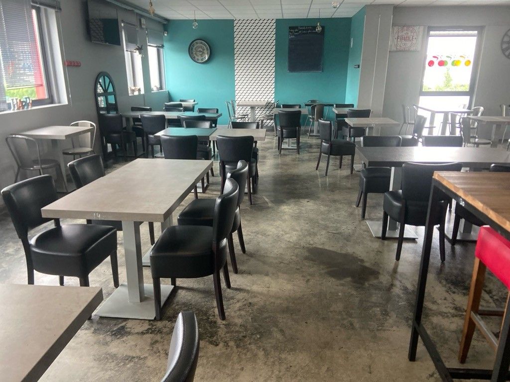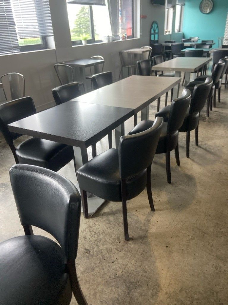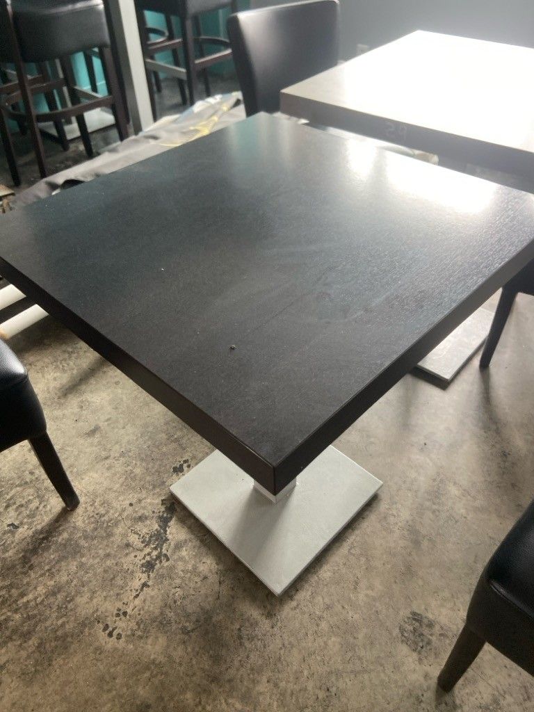 32 square restaurant tables, dark tabletop, central metal ba…