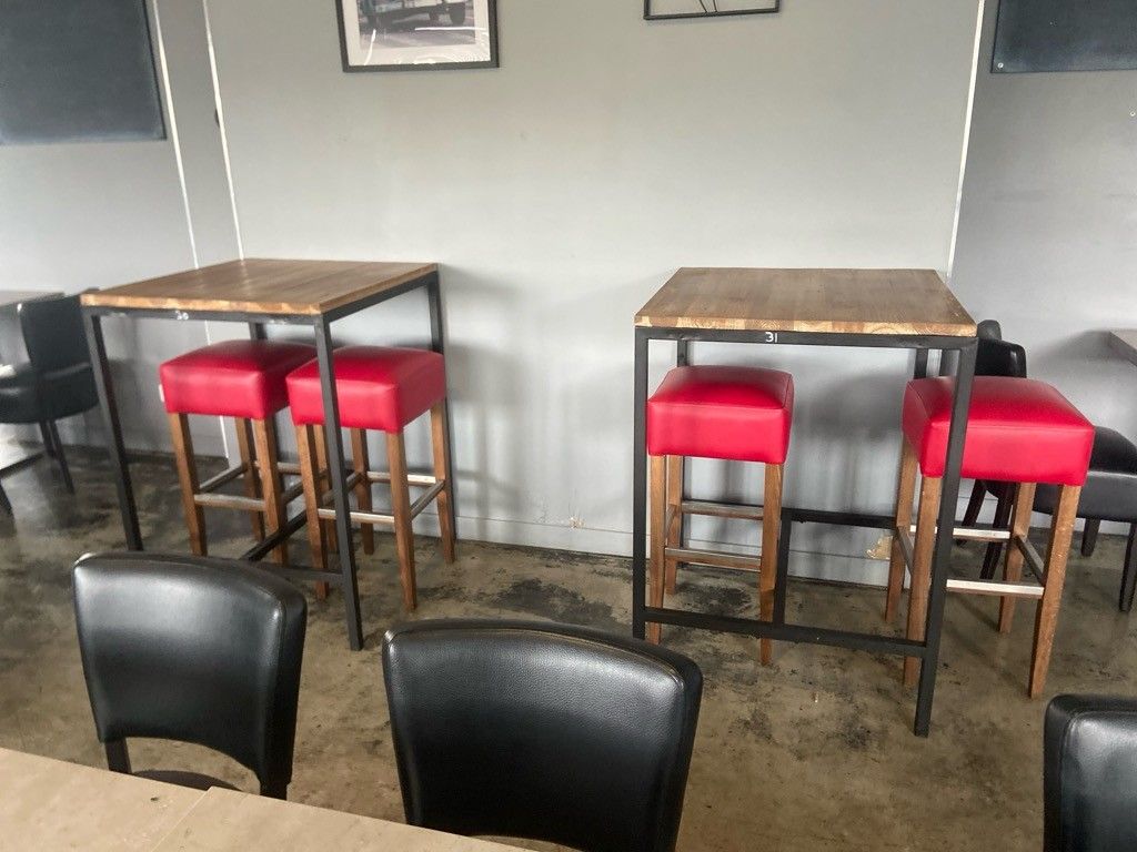 2 square high tables, wooden tops, black metal legs, with 4 high stools with red seats.