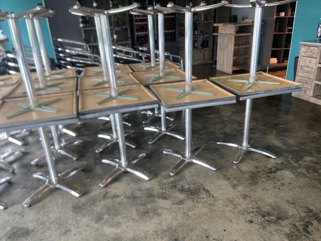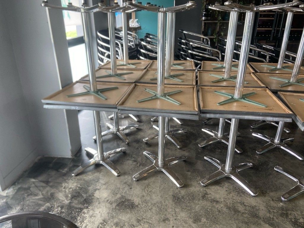 26 square-top restaurant terrace tables with central chrome-plated metal legs.
