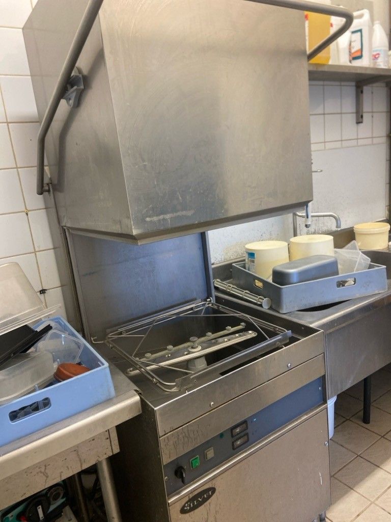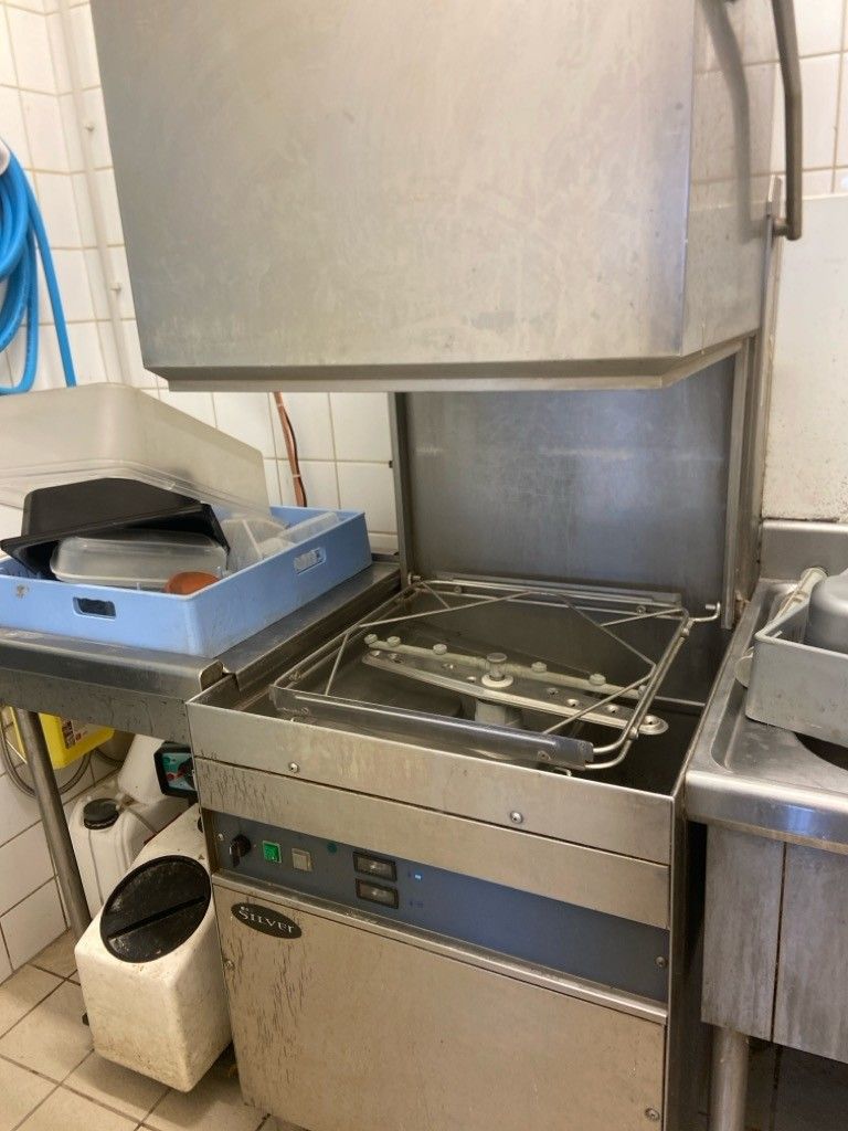 Professional dishwasher with stainless steel bonnet, Silver brand. Catering appliance for intensive washing.