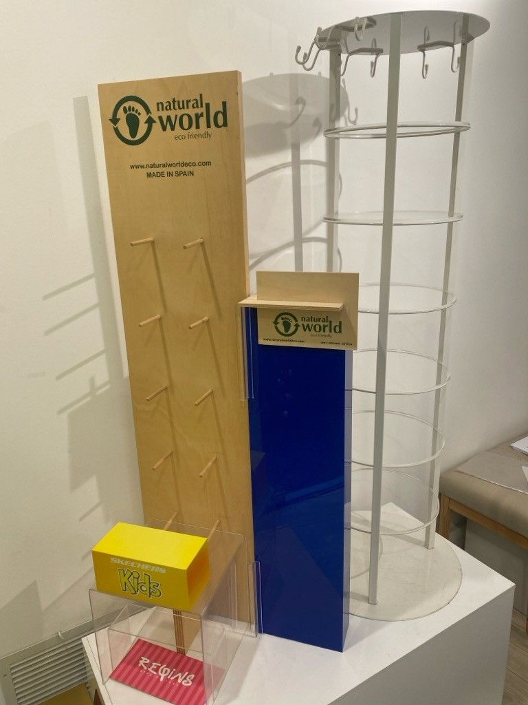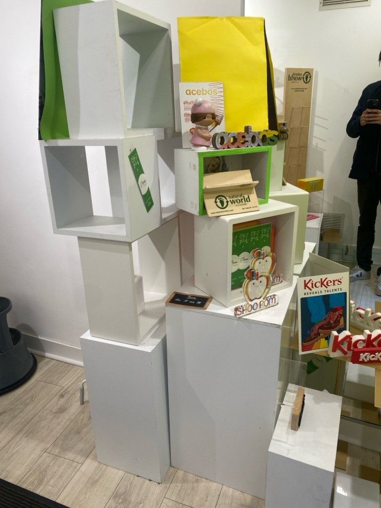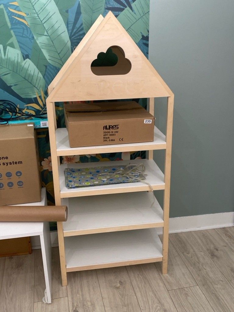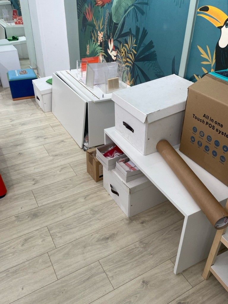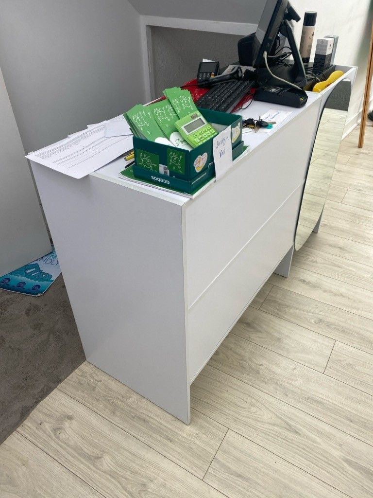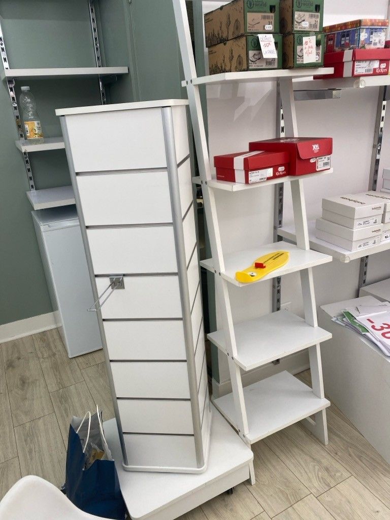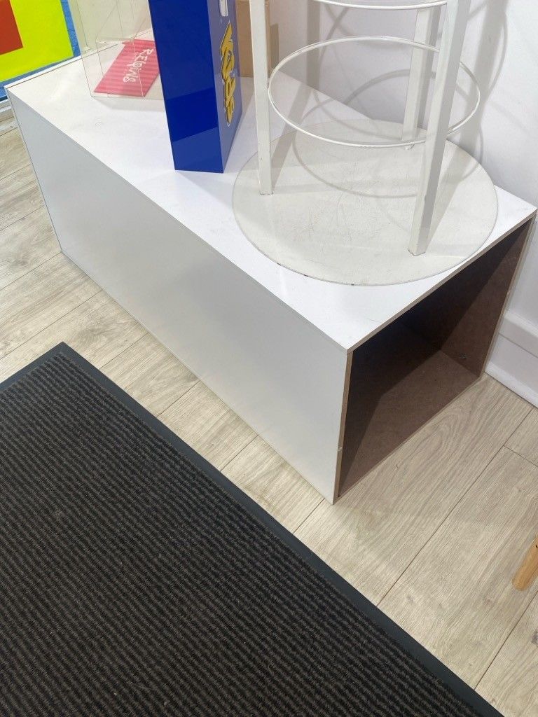 Display and storage furniture set comprising : White melamine-coated laminate shelves and sheaths, white melamine storage niches, reception desk.