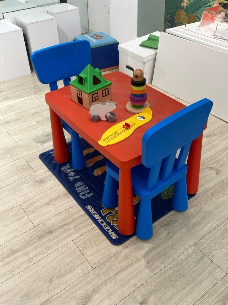 Set of IKEA LÄTT children's furniture, including a red rectangular table and two blue chairs.