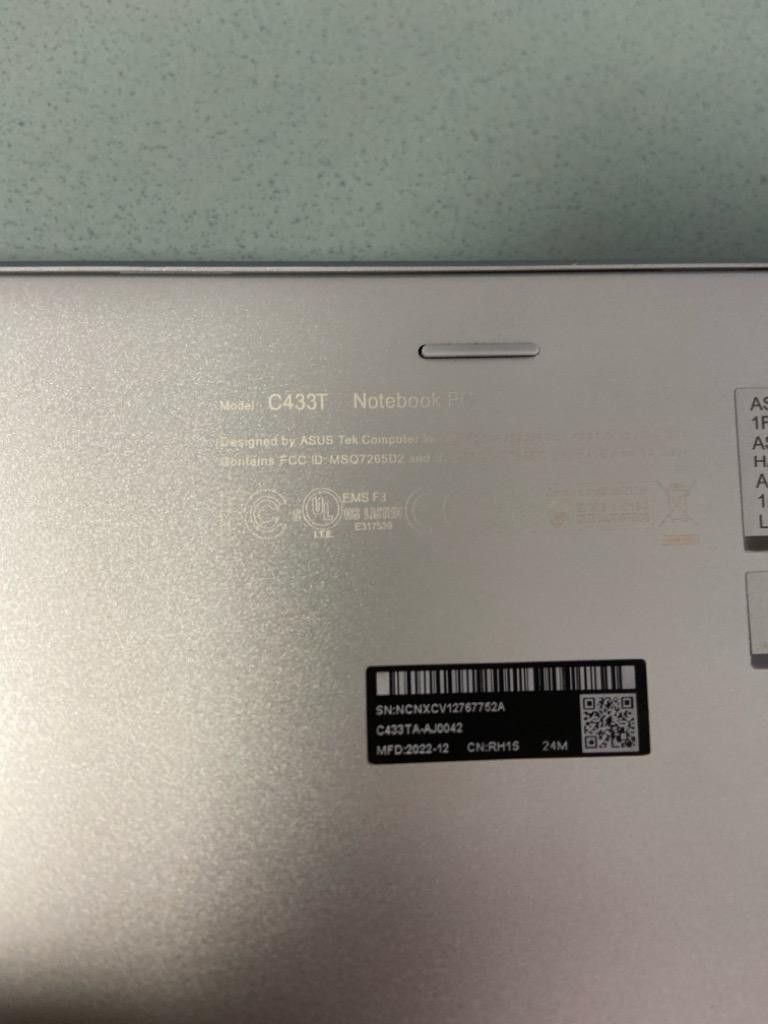1 ASUS laptop model CHROMEBOOK C433T without charger
