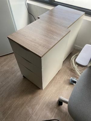 2. white mobile desk pedestals with three drawers, light wood effect top, on castors.