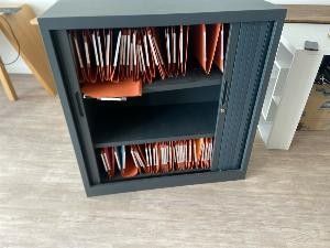 Dark grey metal curtained office cabinet with interior shelving and hanging files.