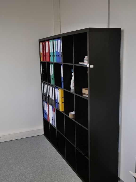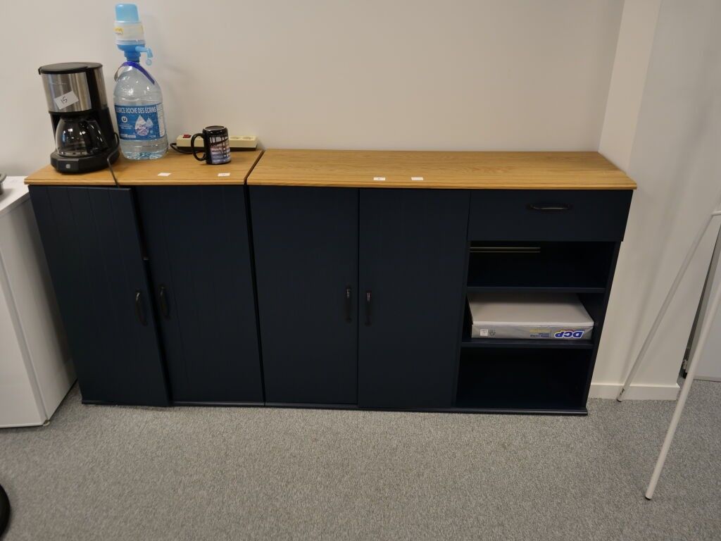 1 SET OF 4 WOODEN DESKS WHITE LACQUERED, + 3 CHAIRS + 2 FURNITURE CABINETS WITH DOORS AND DRAWERS SIZE 70 x 39 x 90, AND 120 x 39 x 90, + 1 FURNITURE CABINET 25 BOXES 182 x 39 x 182, + 1 WHITE FURNITURE CABINET 3 DRAWERS