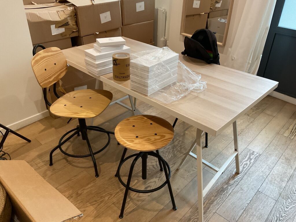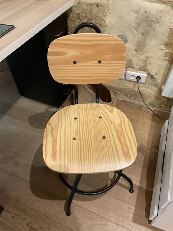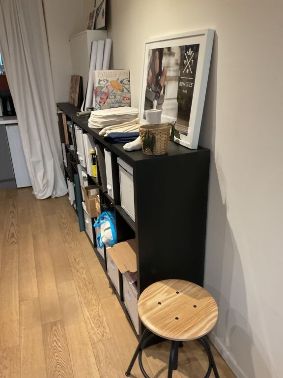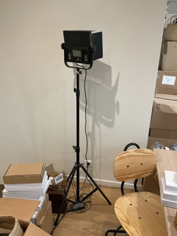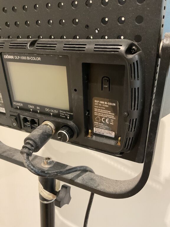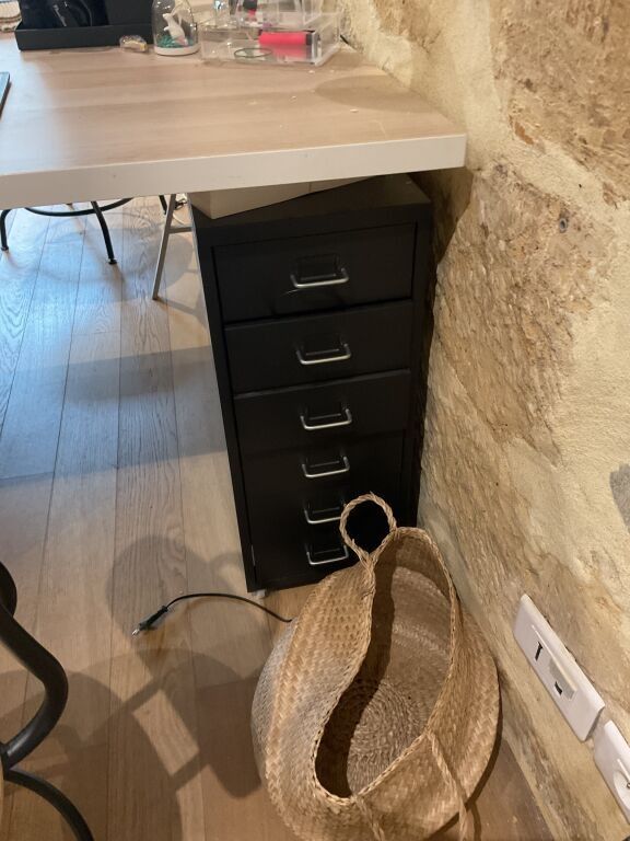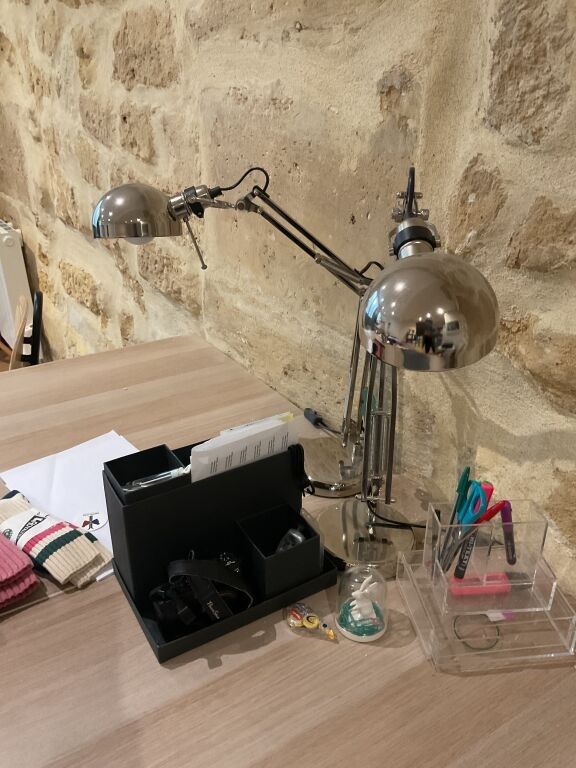 A set of furniture located in the basement: 2 black metal-framed stools 3 black metal-framed swivel chairs 2 trestles and board 1 mirror 1 DÖRR DLP-1000 BI-COLOR LED light on tripod 2 black melamine base units with various compartments 2 chrome table lamps 2 black melamine desks with 4 compartments 1 desk pedestal with 6 drawers