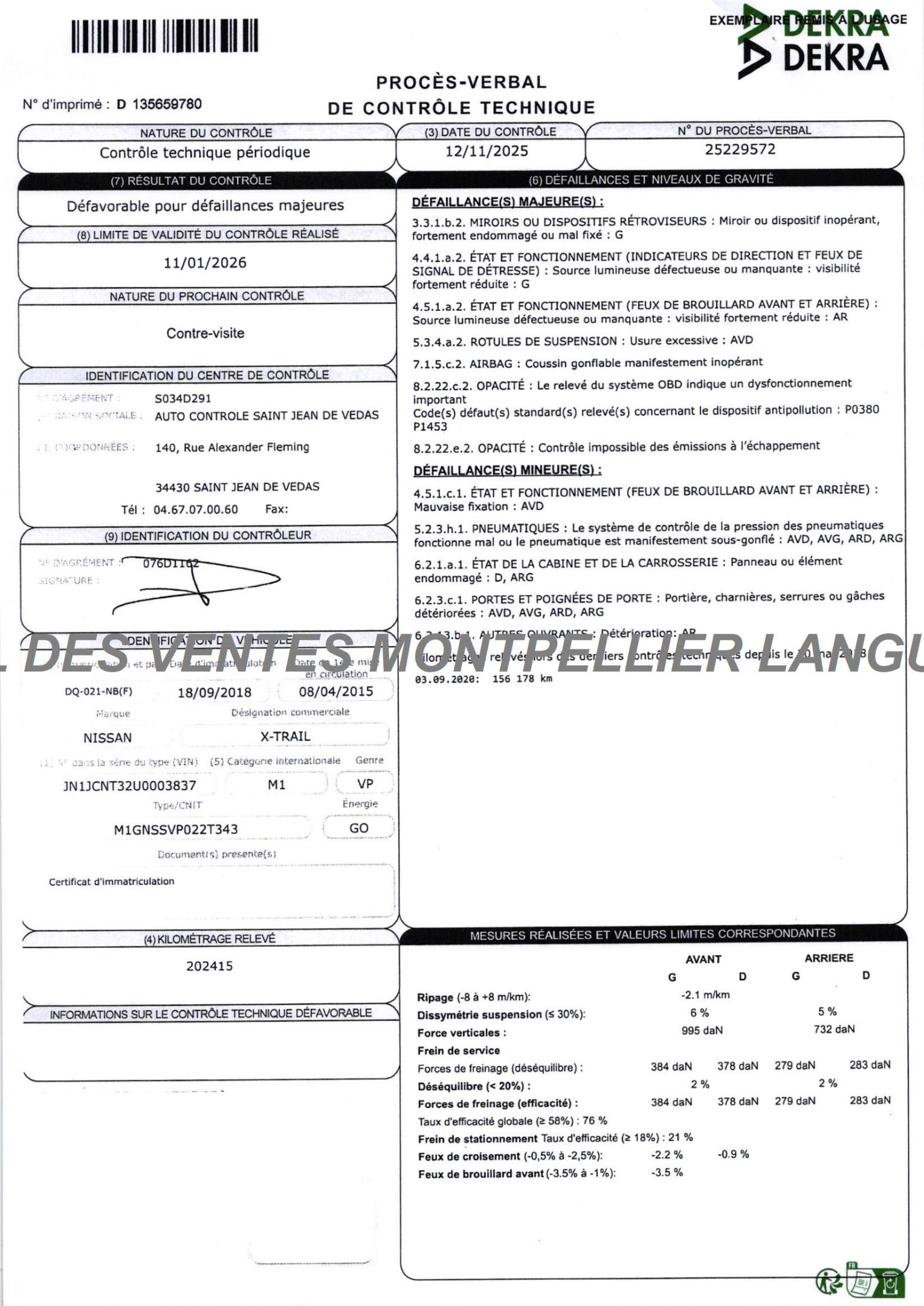 VP BREAK NISSAN Model : X-TRAIL 1.6 dCi 16V 4WD S&S 130 cv Year : 2015 DQ-021-NB Type constructeur : T32BB02 N°de Série : JN1JCNT32U0003837 Date de 1ere mise en service 08/04/2015 Energie : GO Puissance : 7 CV Kilomètres Compteur non garantis : 202415 Contrôle Technique : Oui TVA non récupérable Sans Carte grise originale