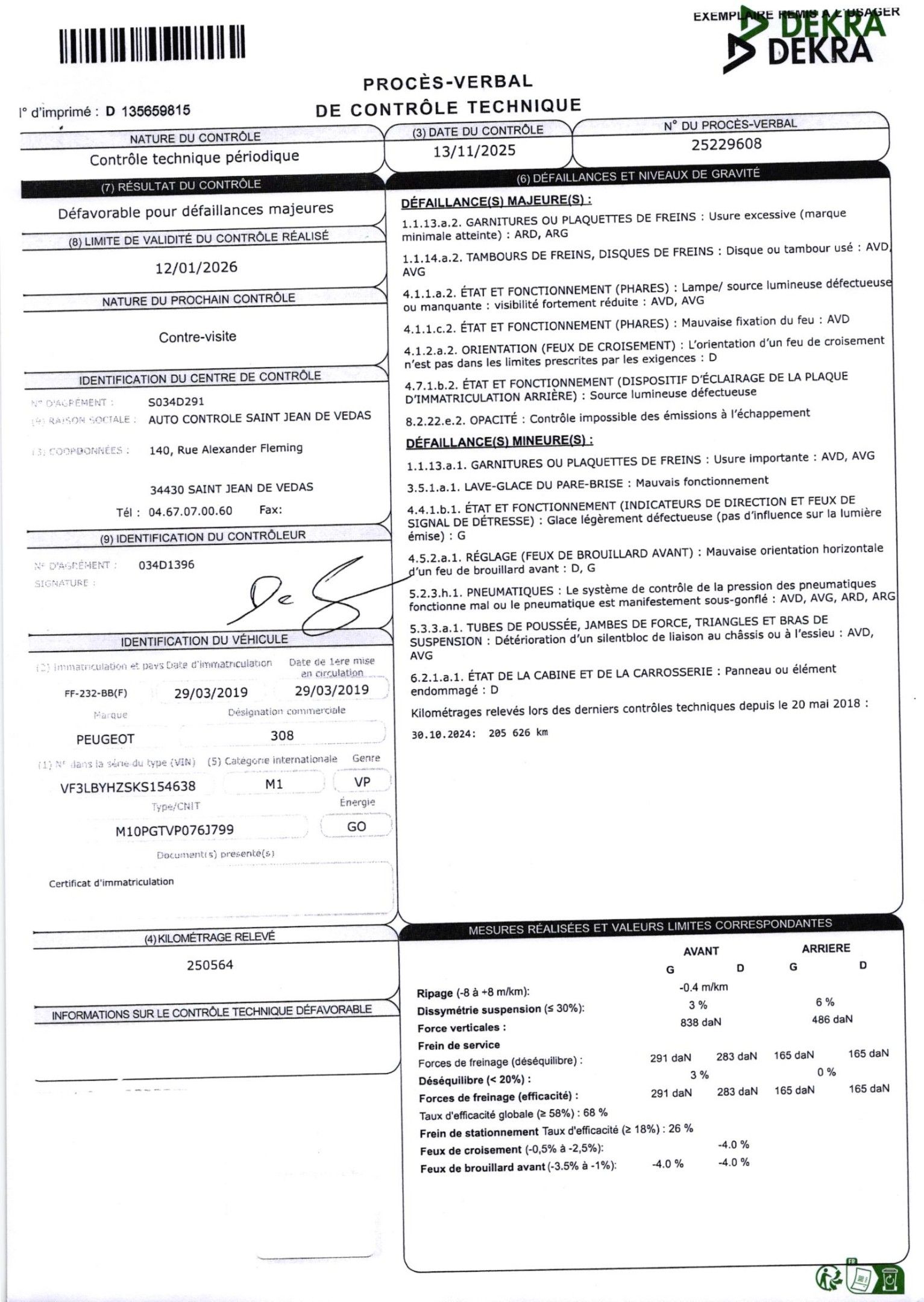 CIV Peugeot Model : 308 1.5 BlueHDi 16V EAT6 S&S 130 cv Gearbox Year : 2019 FF-232-BB Manufacturer Type : LBYHZS-C2K000 Serial Number : VF3LBYHZSKS154638 Date de 1ere mise en service 29/03/2019 Energie : GO Puissance : 6 CV Kilomètres Computeur non garantis : 250564 Contrôle Technique : Oui TVA non récupérable Avec Carte grise originale