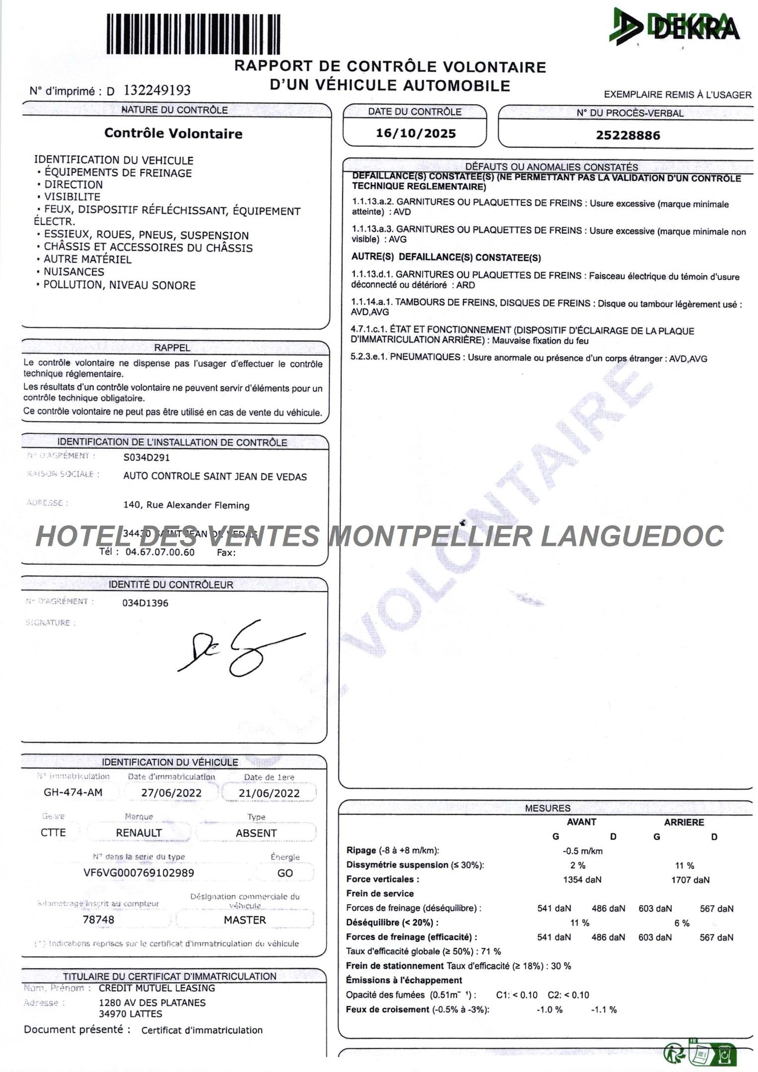 RENAULT TIPPER Model: MASTER F3500 L3 BLUE DCI 165 CV Year: 2022 GH-474-AM Manufacturer Type: VGUM00AE6EV0BXC35R Serial Number: VF6VG000769102989 Date de 1ere mise en service 21/06/2022 Energy: GPL Power: 6 CV Kilometers Meters not guaranteed: 78748 Technical Inspection: Yes VAT recoverable With original registration document