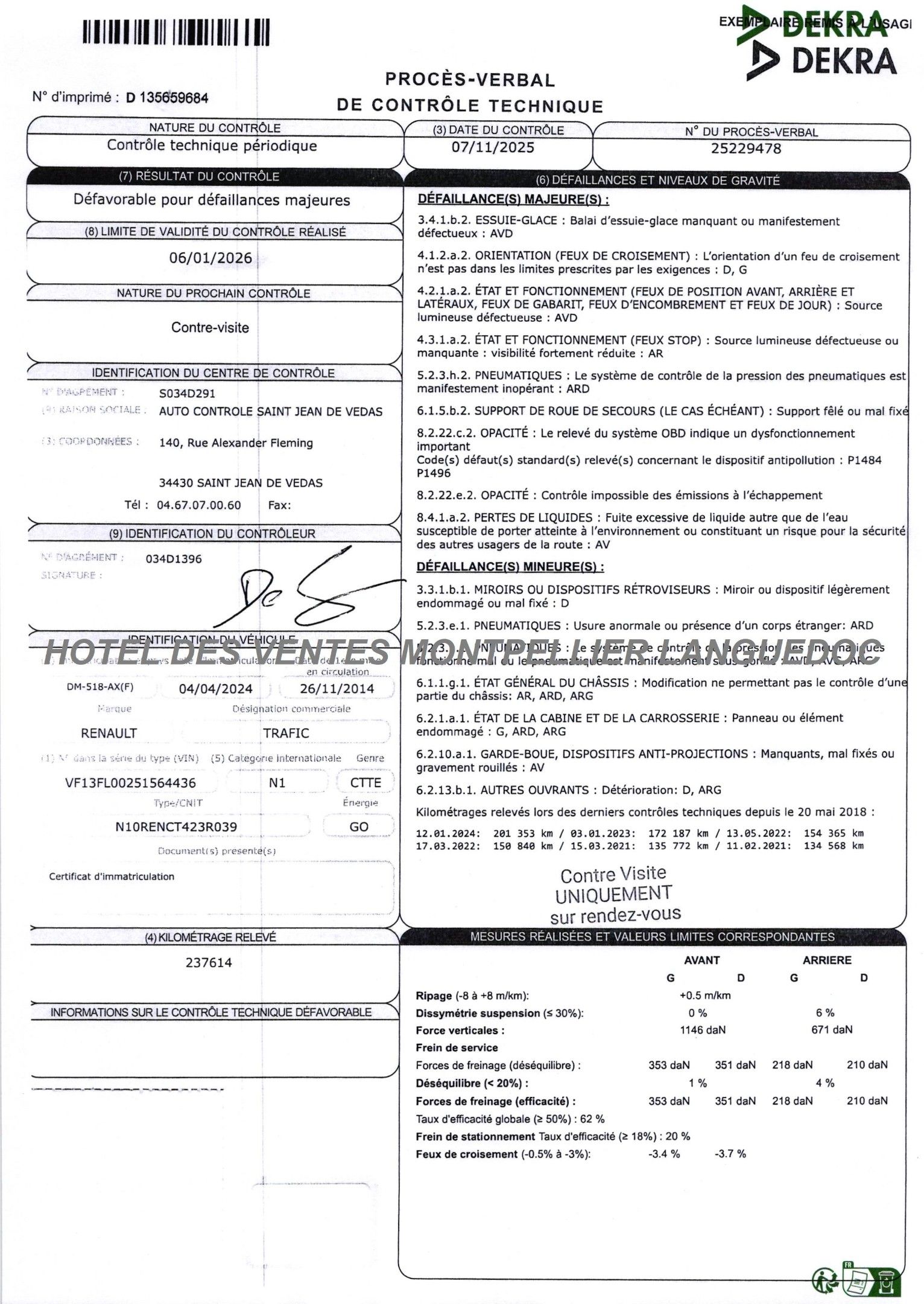 CTTE FOURGON RENAULT Model : TRAFIC 1.6 dCi 16V 115 cv Year : 2014 DM-518-AX Type constructeur : 3FL002 N°de Série : VF13FL00251564436 Date de 1ere mise en service 26/11/2014 Energie : GO Puissance : 5 CV Kilomètres Compteur non garantis : 237614 Contrôle Technique : Oui TVA récupérable Sans Carte grise originale