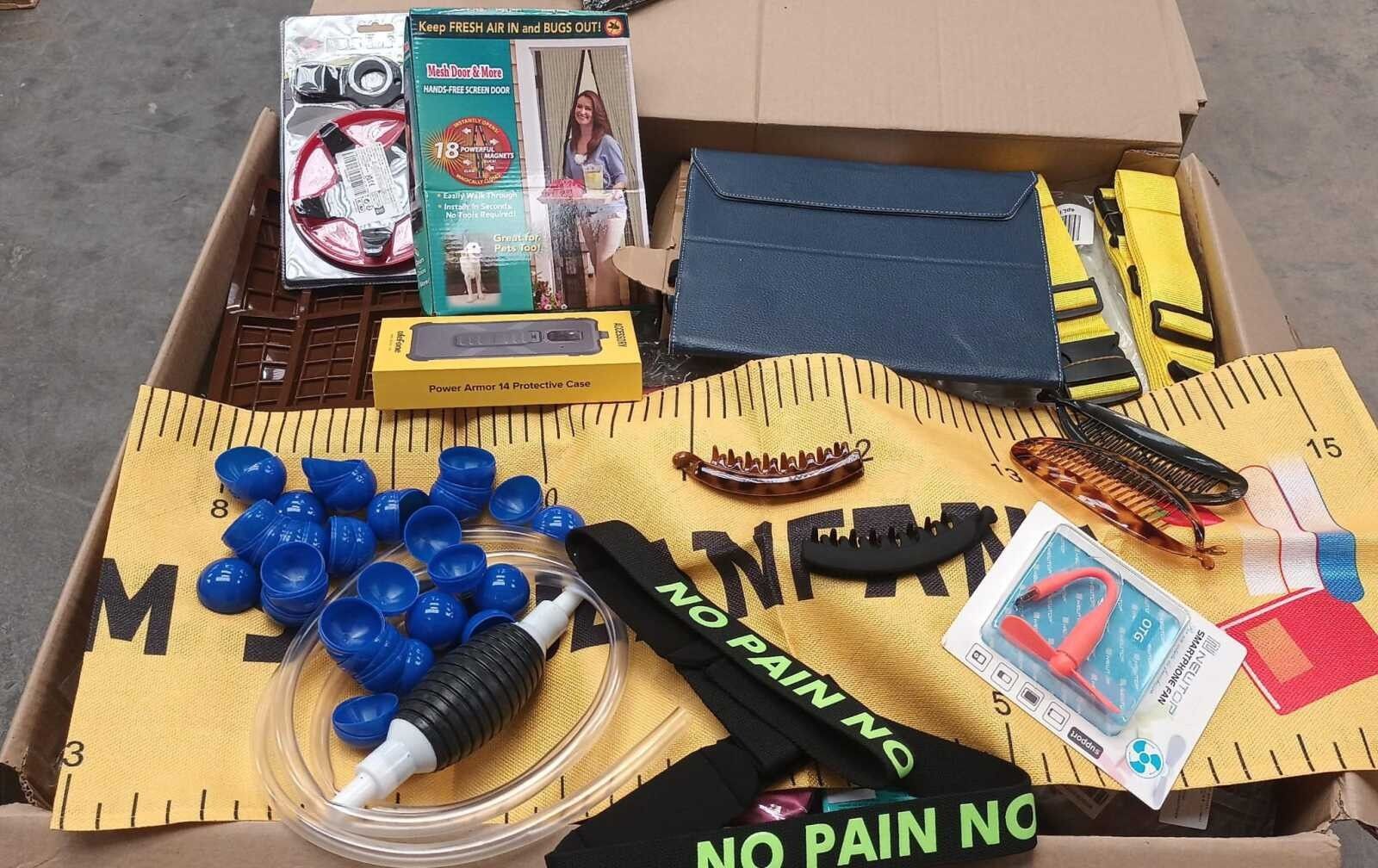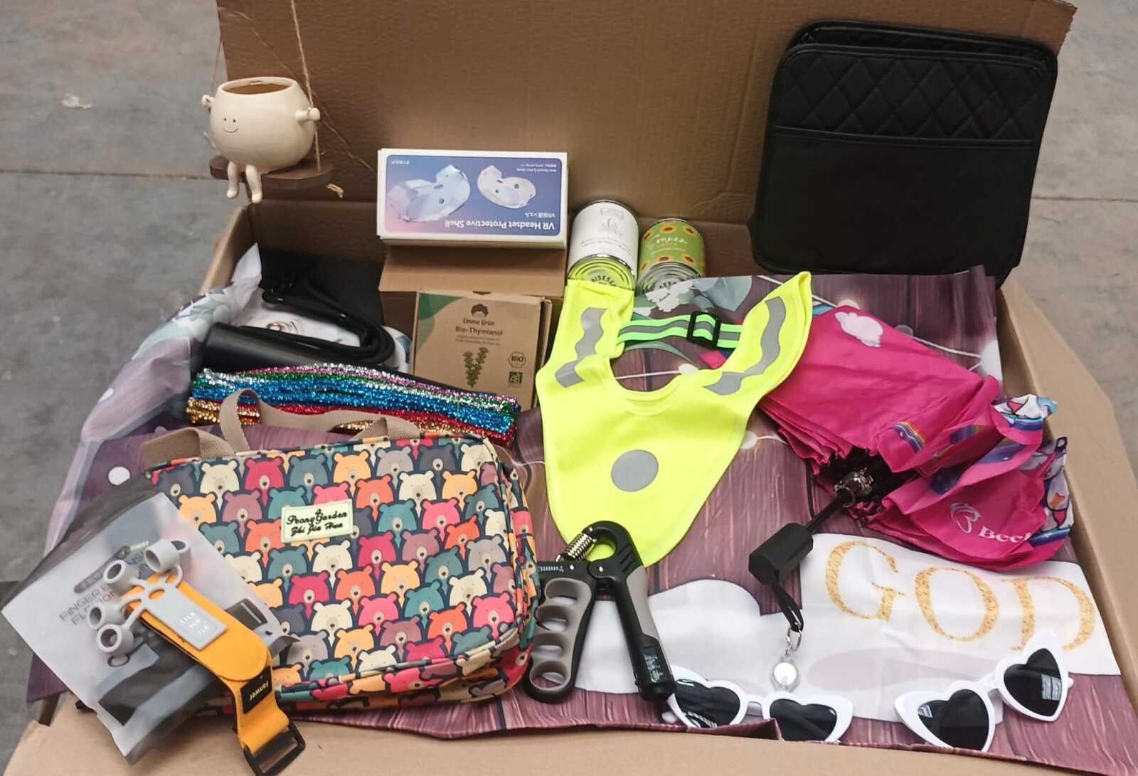 9714-295 / 1 pallet of 2 boxes containing 87 kg of mix (hair clips, mini phone fan, tablet cover, mosquito net, suitcase straps, smartphone cover, flower seeds, umbrella, toilet bag, flower pot, strength trainer, VR headset accessory, glasses) /// SOLD AS IS