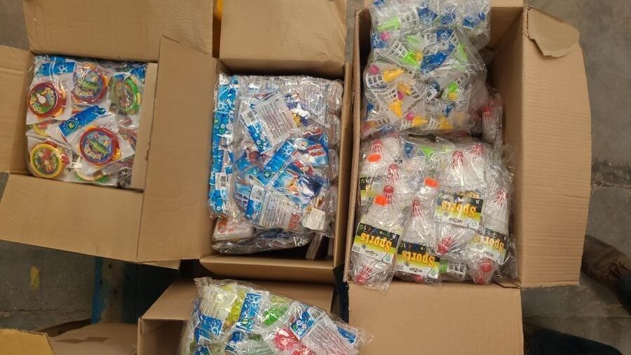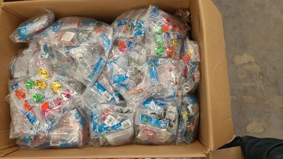 9933-5 / 1 pallet of 82 kg of children's toys including ( badminton shuttlecock, bird whistle, plastic dinosaur, friction car, ride-on robot, bilboquet, spinning top with launcher etc ) /// AS NEW