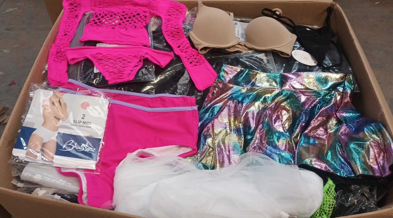 9880-290 / 2 x 69 kg boxes of mixed women's and children's textiles (swimwear, tank tops, bra padding, shirts, underwear) /// SOLD AS IS