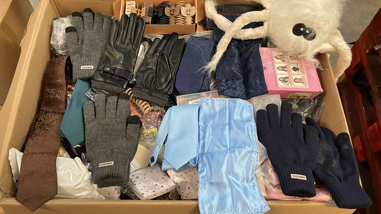 9880-288 / 2 boxes of 60 kg of mix (balaclava, hat, gloves, hair clips, key rings, curlers, bow tie, tie) /// SOLD AS IS