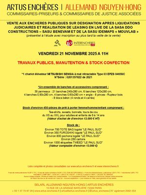 SALE BY PUBLIC AUCTION ON DESIGNATION IN LIVE AFTER JUDICIAL LIQUIDATIONS AND REALIZATION OF LEASING OF SASU BENEVAM - SASU IDEMAPS / MOUVLAB - SASU DDO CONSTRUCTIONS | TRAVAUX PUBLICS, MANUTENTION & STOCK CONFECTION