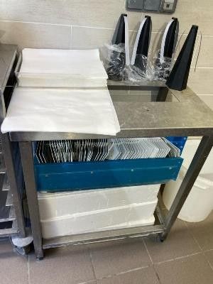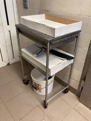 Set of 2 stainless steel trolleys on castors and 1 stainless…