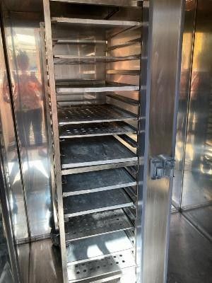 ACTIF positive refrigeration cabinet with two stainless steel tray trolleys.