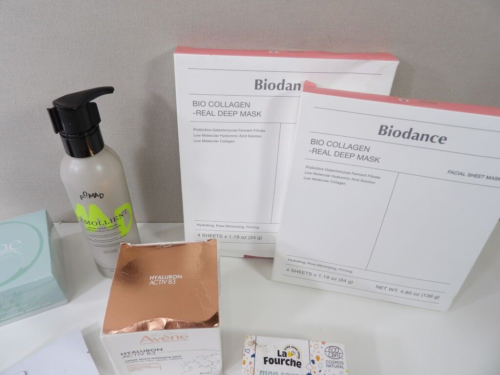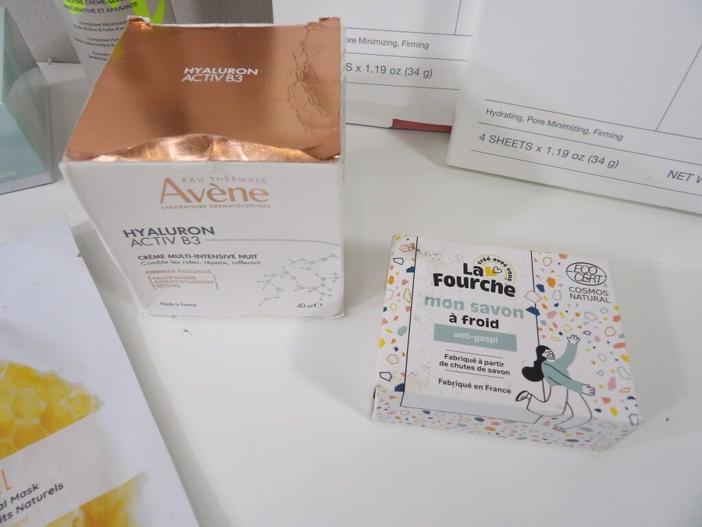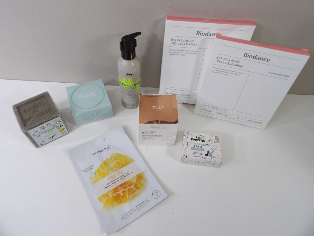 Set of x8 CARES and MASKS (new and used): Aloe anti dark circles, Avene HYALURON ACTIV B3 multi-intensive night cream, POMAD cream and serum, Solid soaps, and x2 BIODANCE masks with bio collagen. Another mask is included.