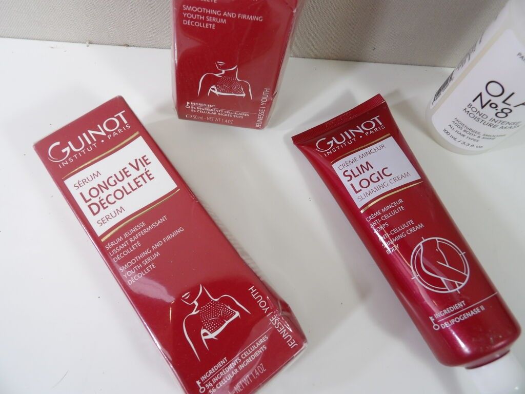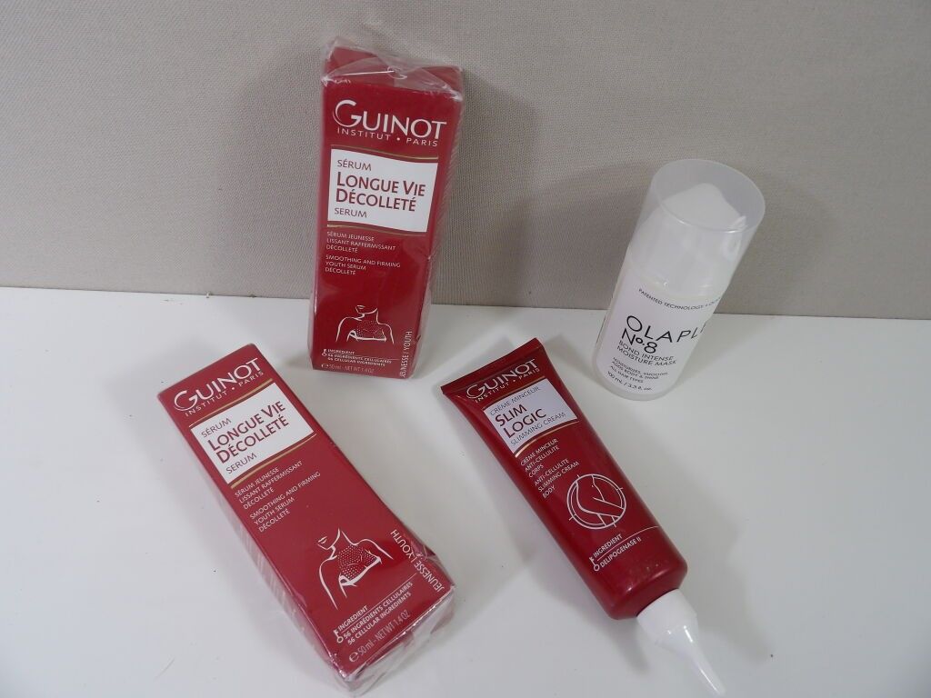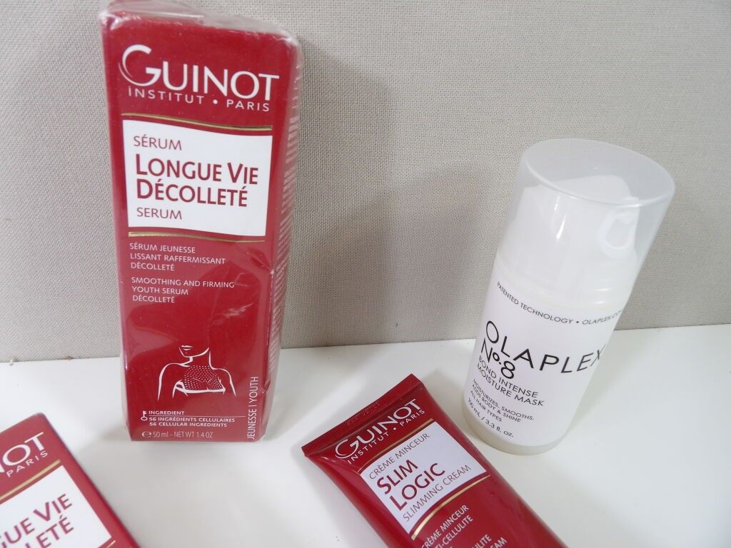 GUINOT Institut Paris: set of x3 items and x1 OLAPLEX (new and used): Youth serum, Anti-cellulite slimming cream, Long life décolleté and Bond intense moisture Mask for hair N°8.