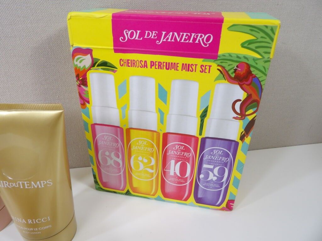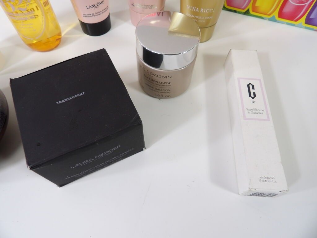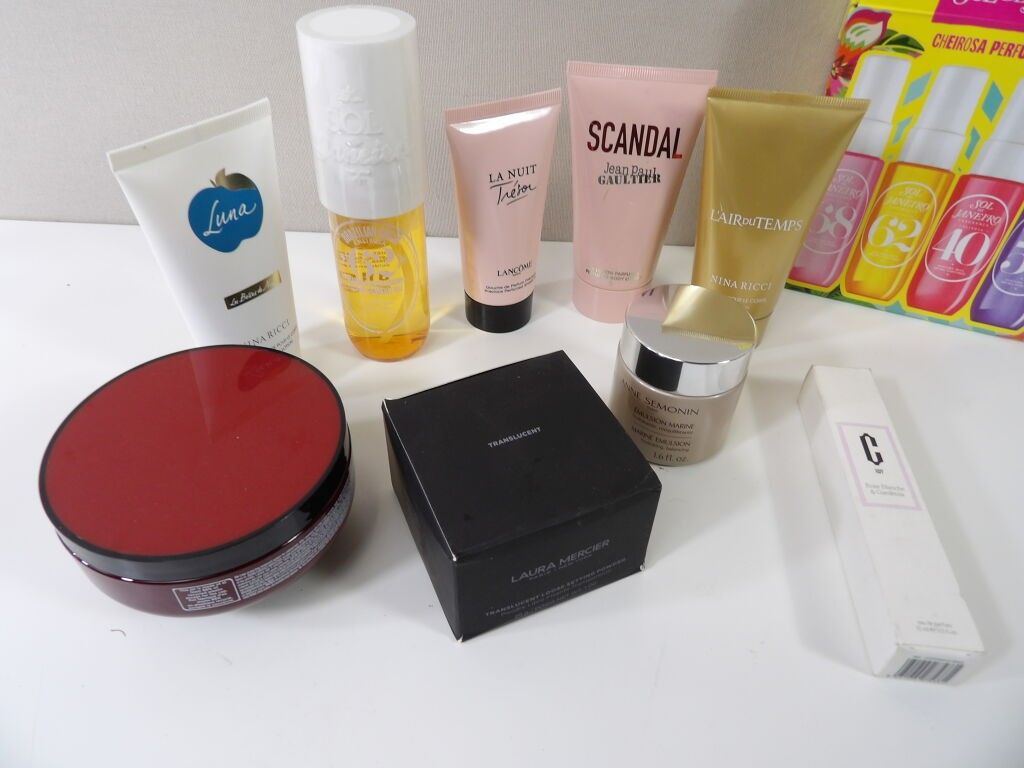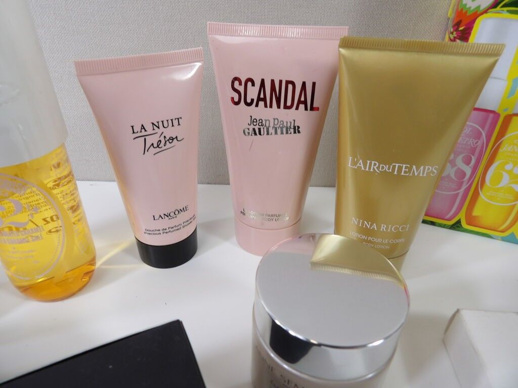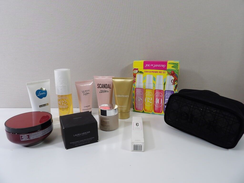 Lot of x10 COSMETICS (new and used) and a small DIOR make up bag: Sol de Janeiro, SCANDAL Jean paul Gaultier lotion, La nuit trésor Lancome perfume shower, NINA RICCI lotion, protective mask for coloured hair ....