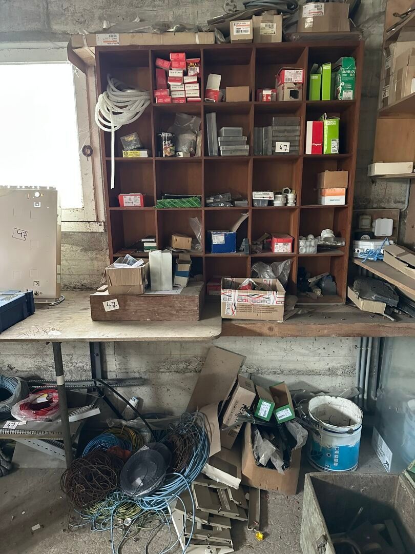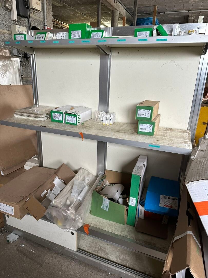 A metal gondola containing a stock of circuit breakers, modular electrical equipment, electrical cabinet plates and miscellaneous items.