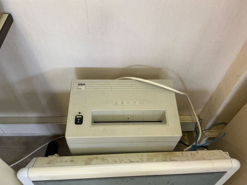 An IDEAL2250 document shredder, a wood laminate desk, a pair…