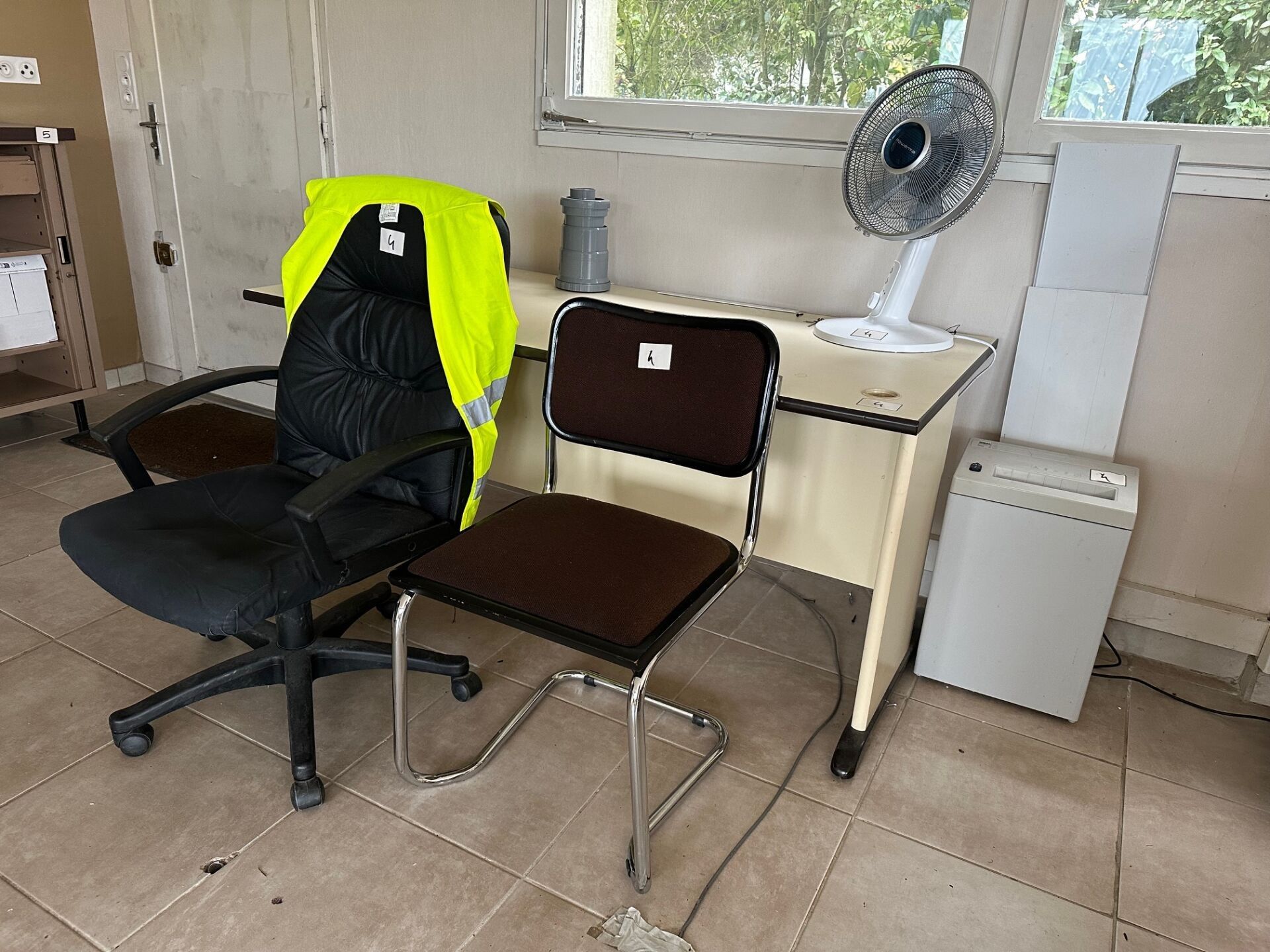 An IDEAL2250 document shredder, a wood laminate desk, a pair of brown fabric visitor chairs, a leather typing chair and a fan.