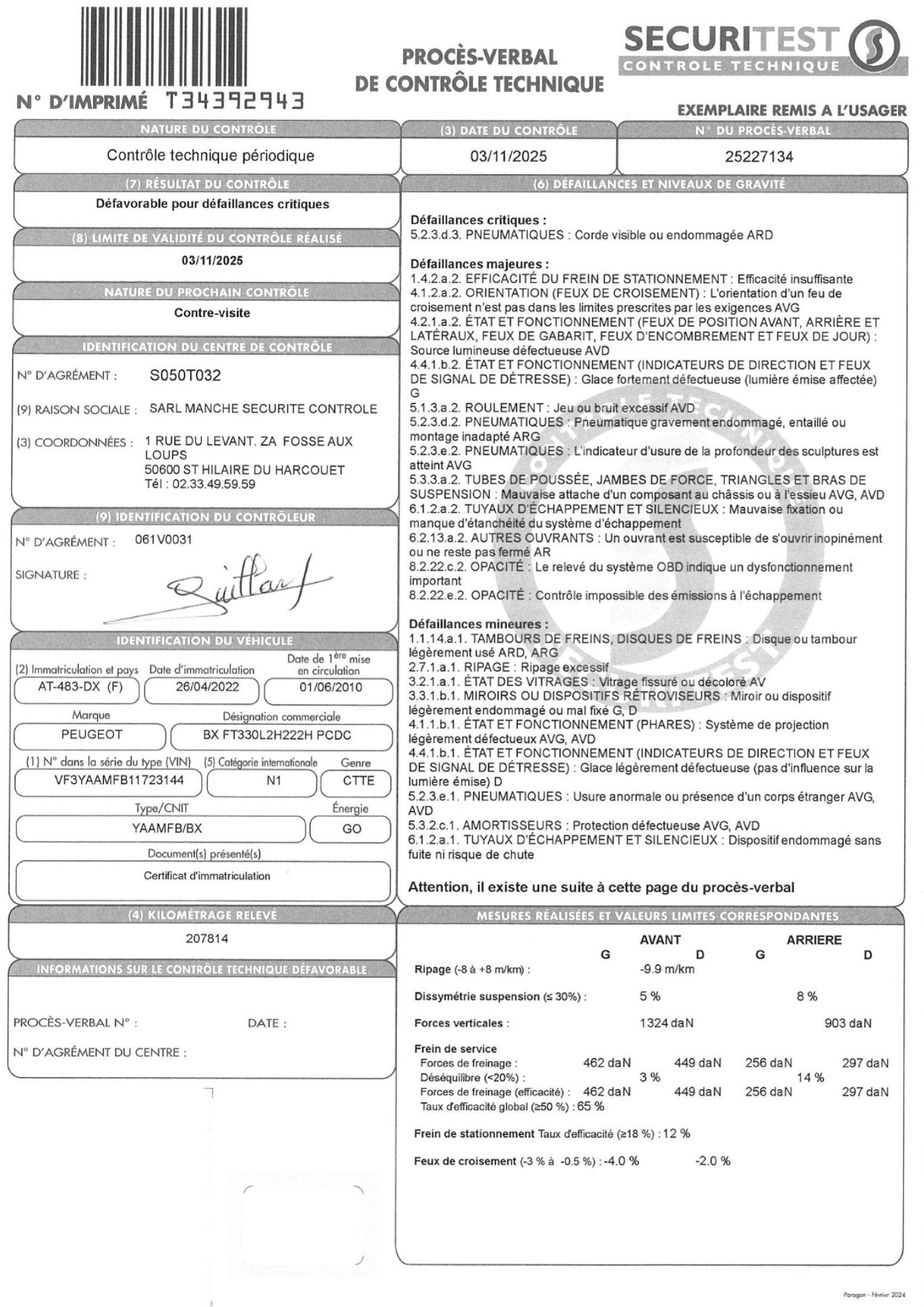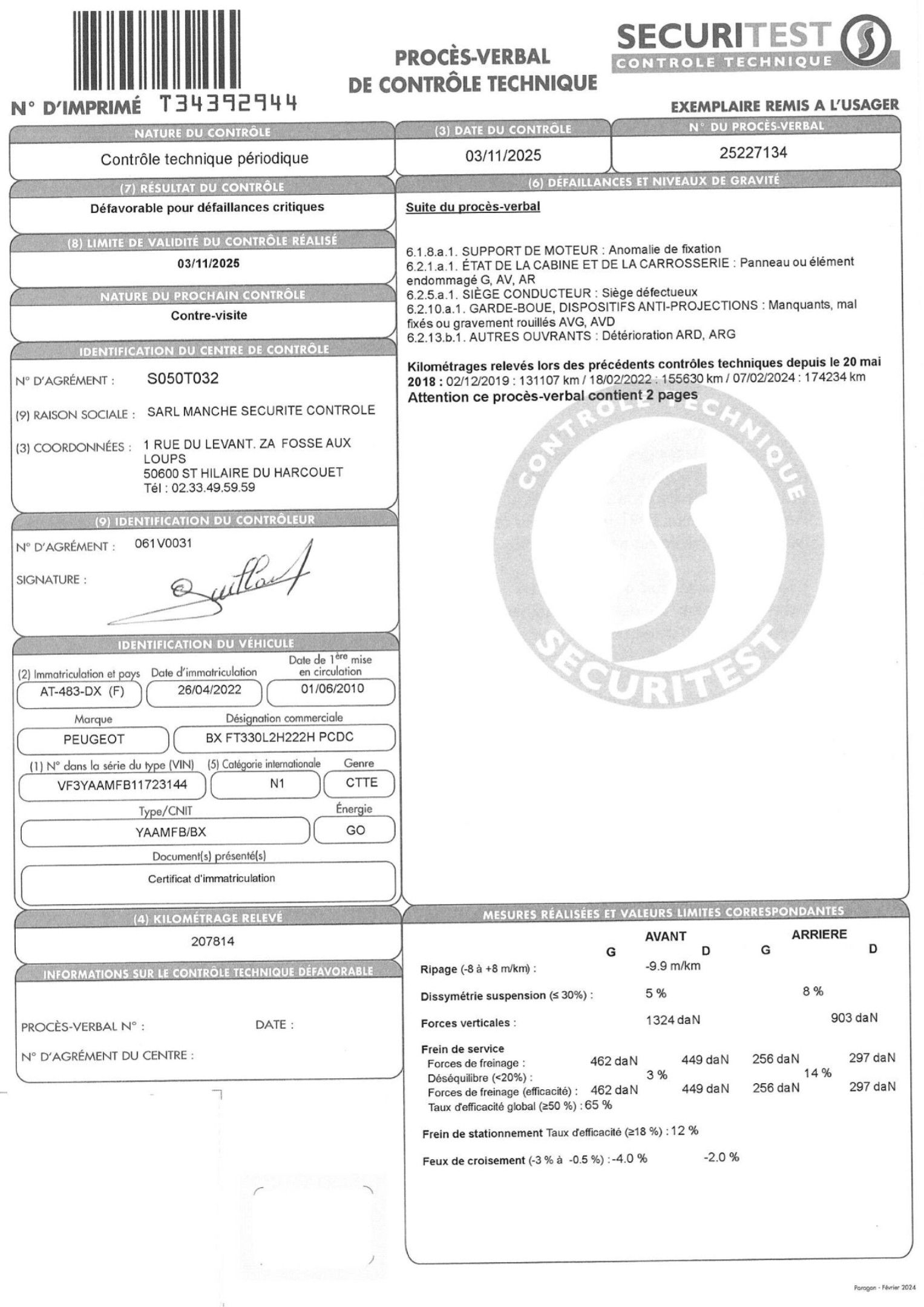 Technical inspection dated 03/11/2025 (unfavourable) at the buyer's expense (78€)