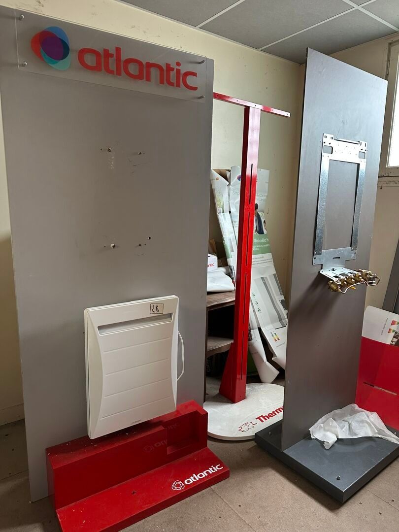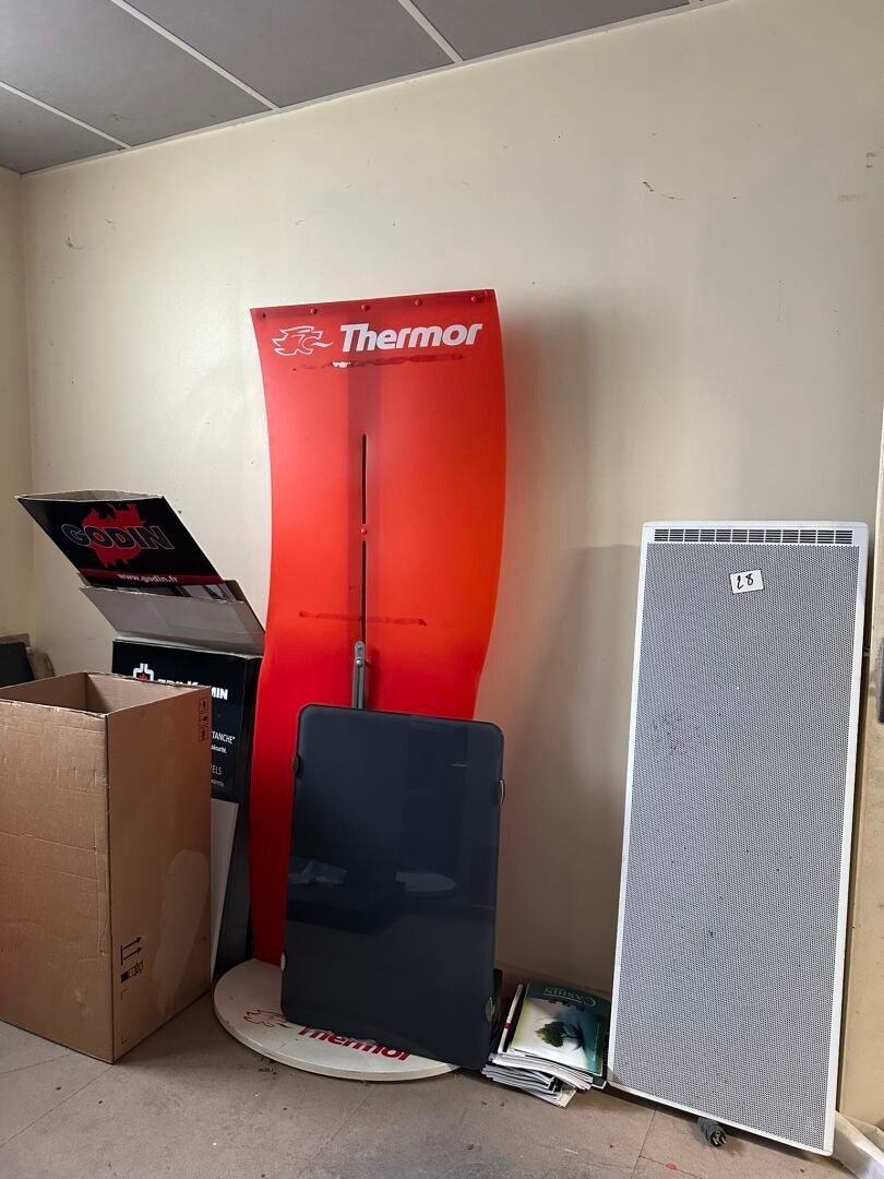 Set of three electric radiators. Christmas decorations, three metal display stands, a display heater and 4 new mirrors are included.