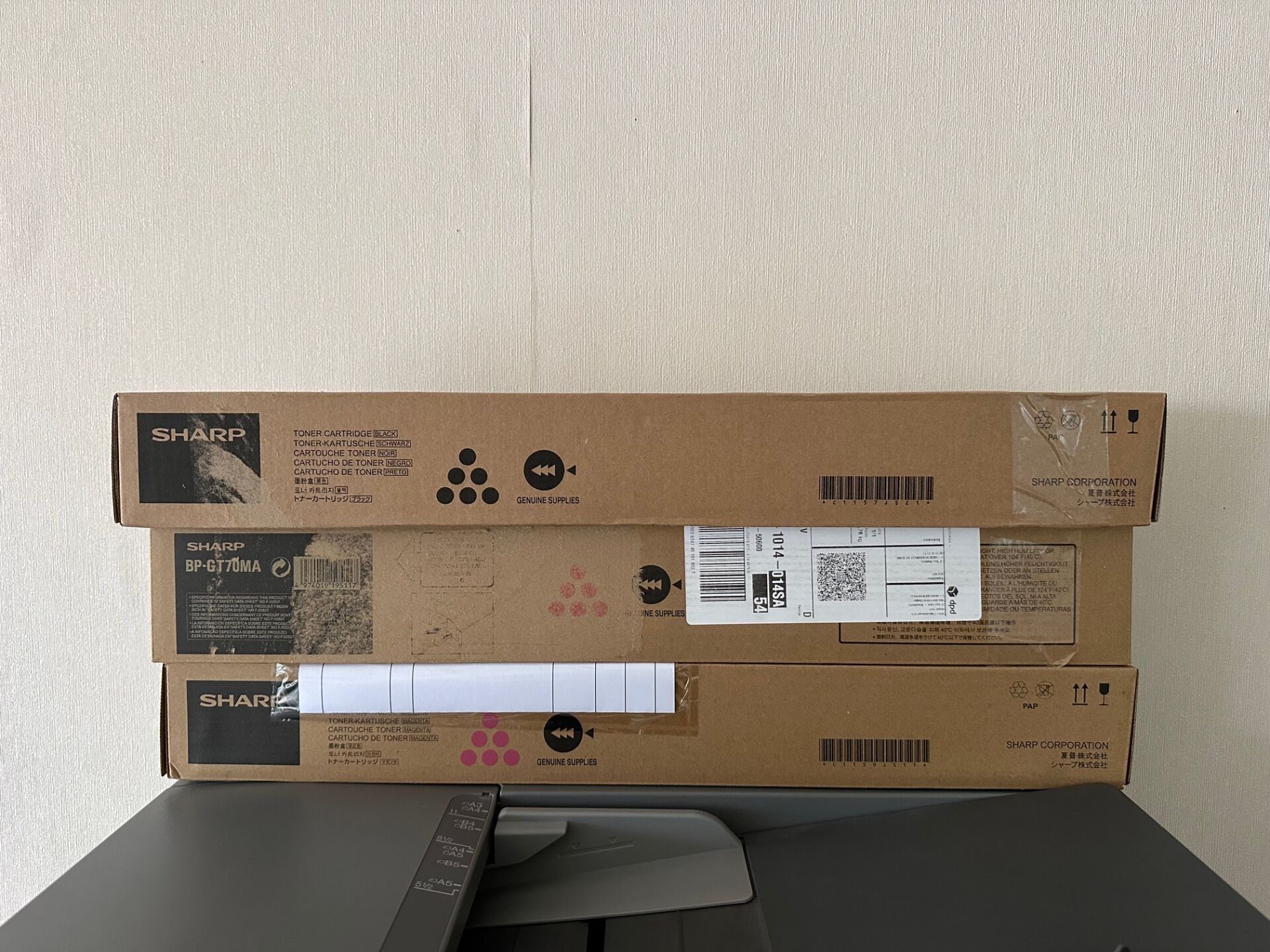 A SHARP BP-50C26 photocopier (plate not visible). Three SHARP toners attached (1 black of red)
