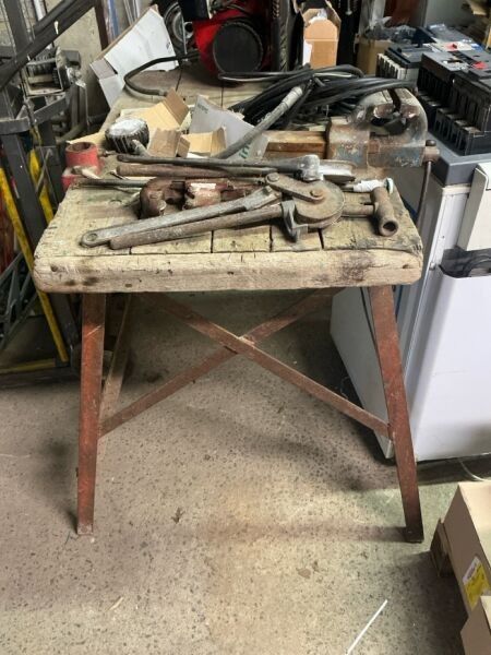 A rectangular wooden workbench with metal legs. A vice is attached.