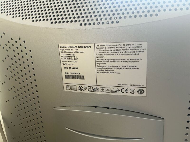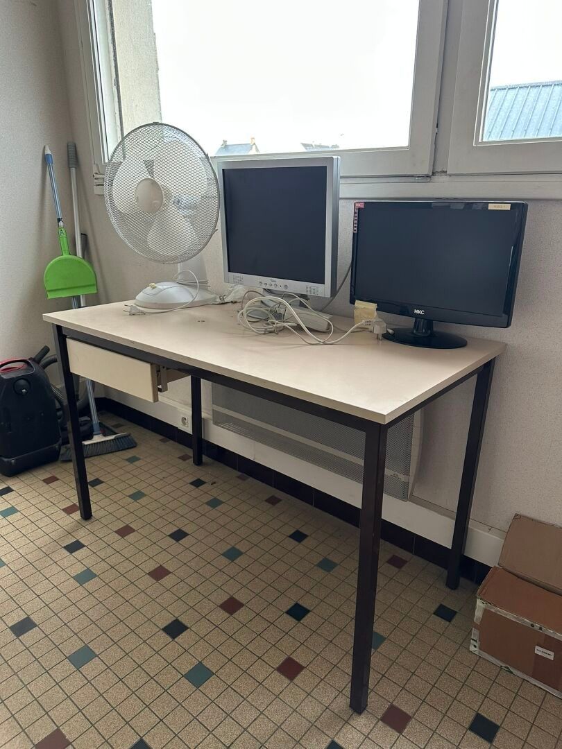 Two computer screens, one HKC (model: 9809A) and one FUJITSU (model: C19-1/NS: YEBX0078078). A laminate table with metal legs and a fan are included.