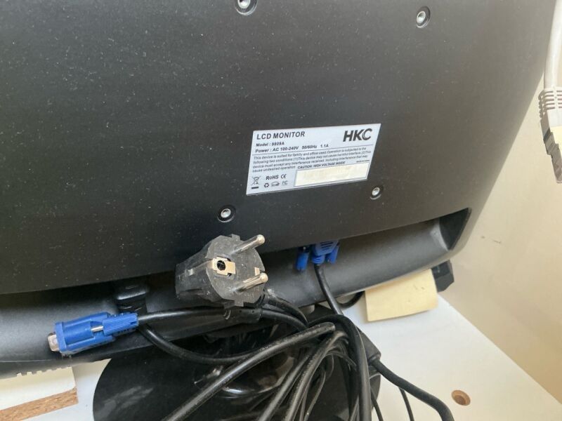 Two computer screens, one HKC (model: 9809A) and one FUJITSU…