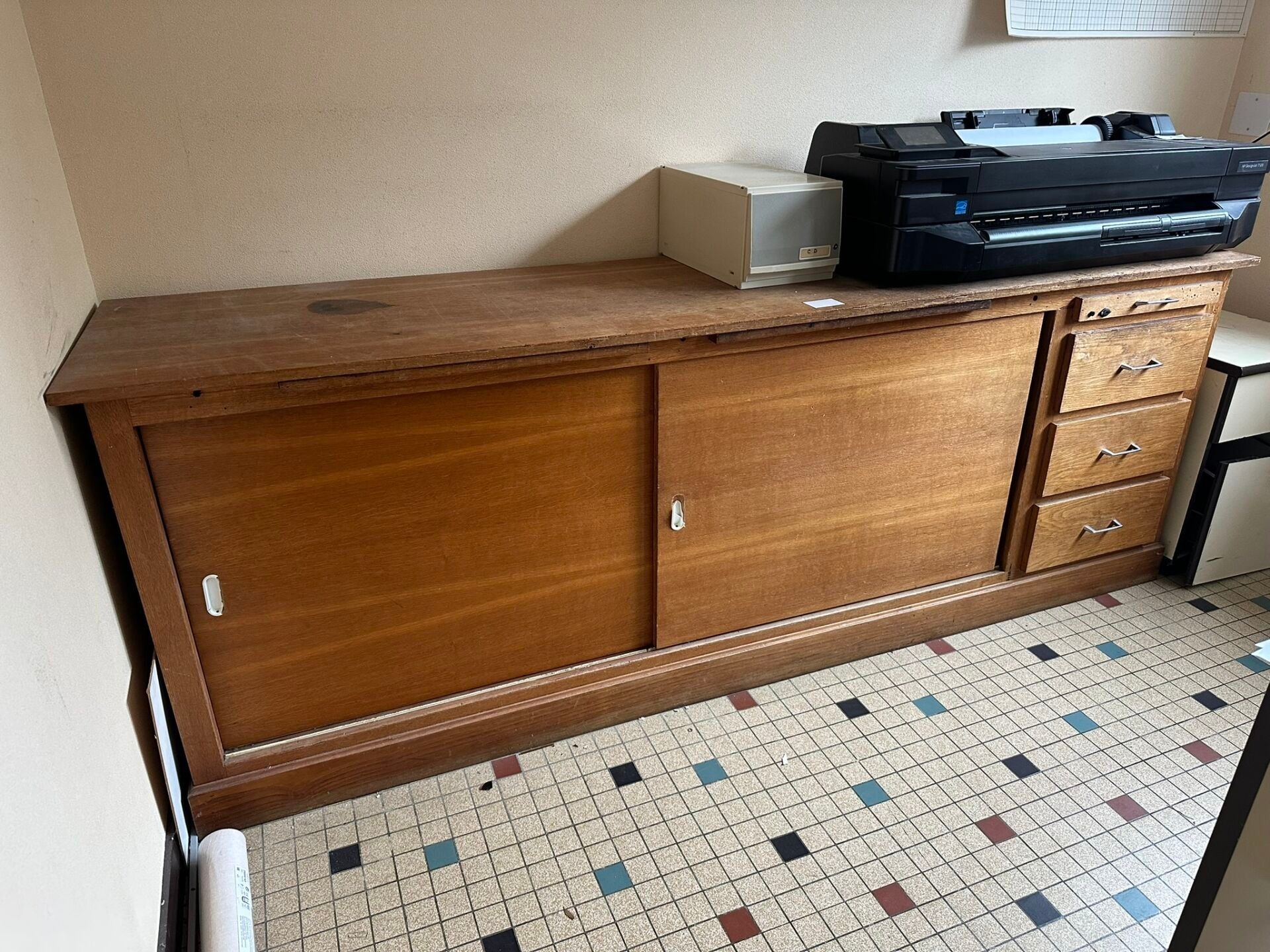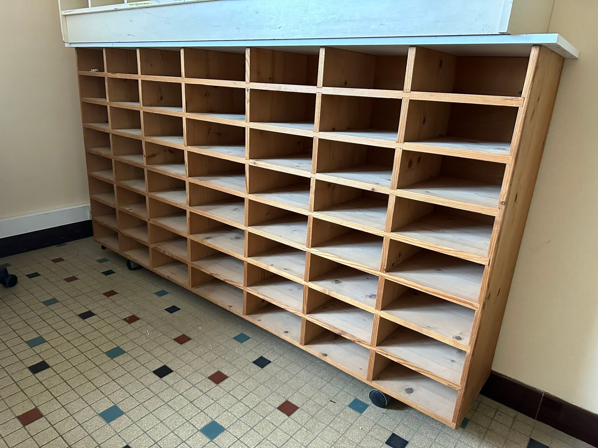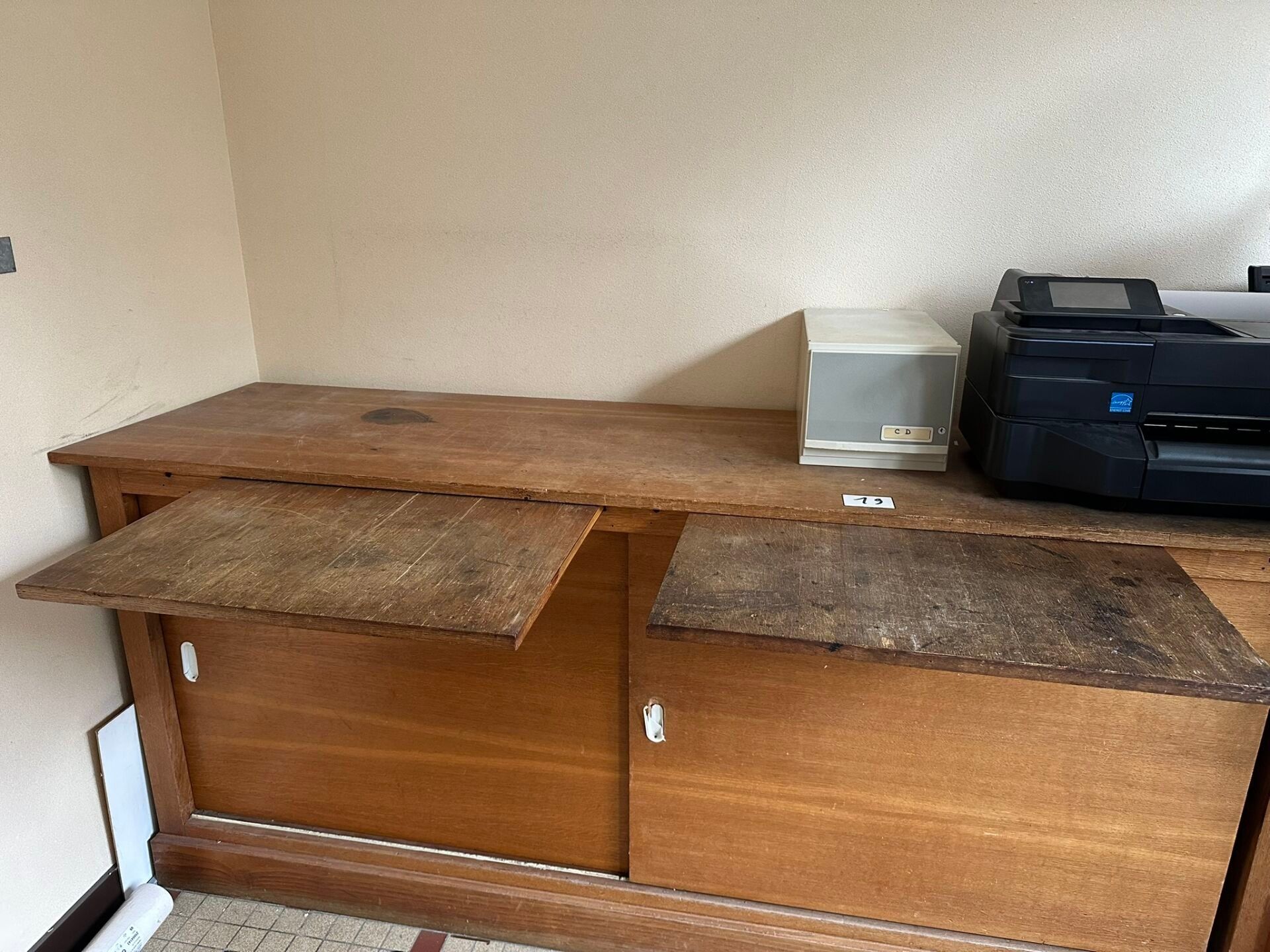 An oak cabinet comprising a base unit with two sliding doors, two front shelves and three drawers (84cm/235cm/54.5cm) topped by a shelf with 48 compartments (98/195/31cm).