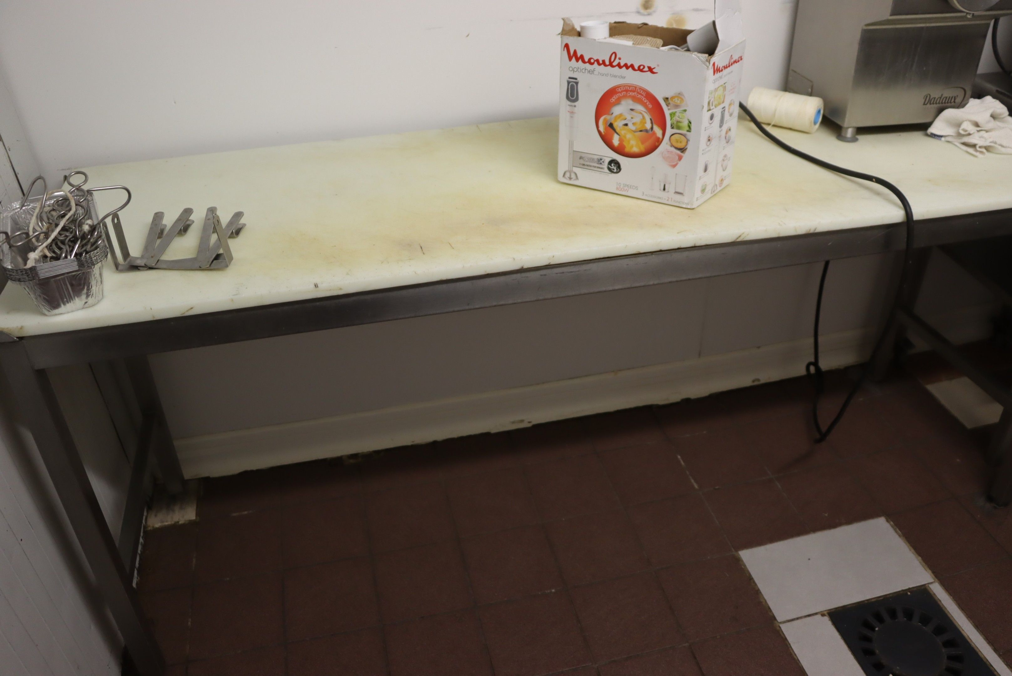 A table with stainless steel legs and polyethurane top. Length: 200cm approx.