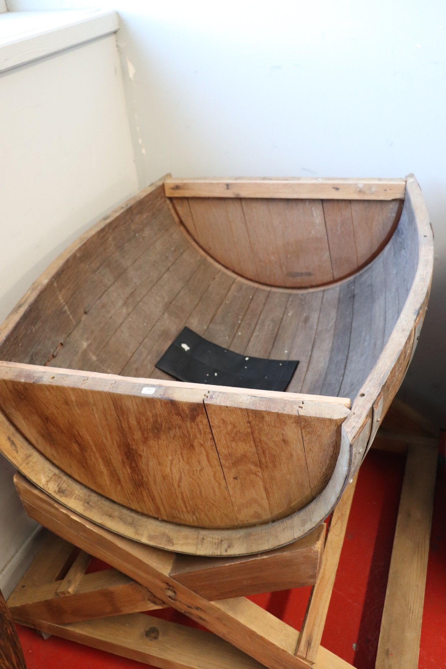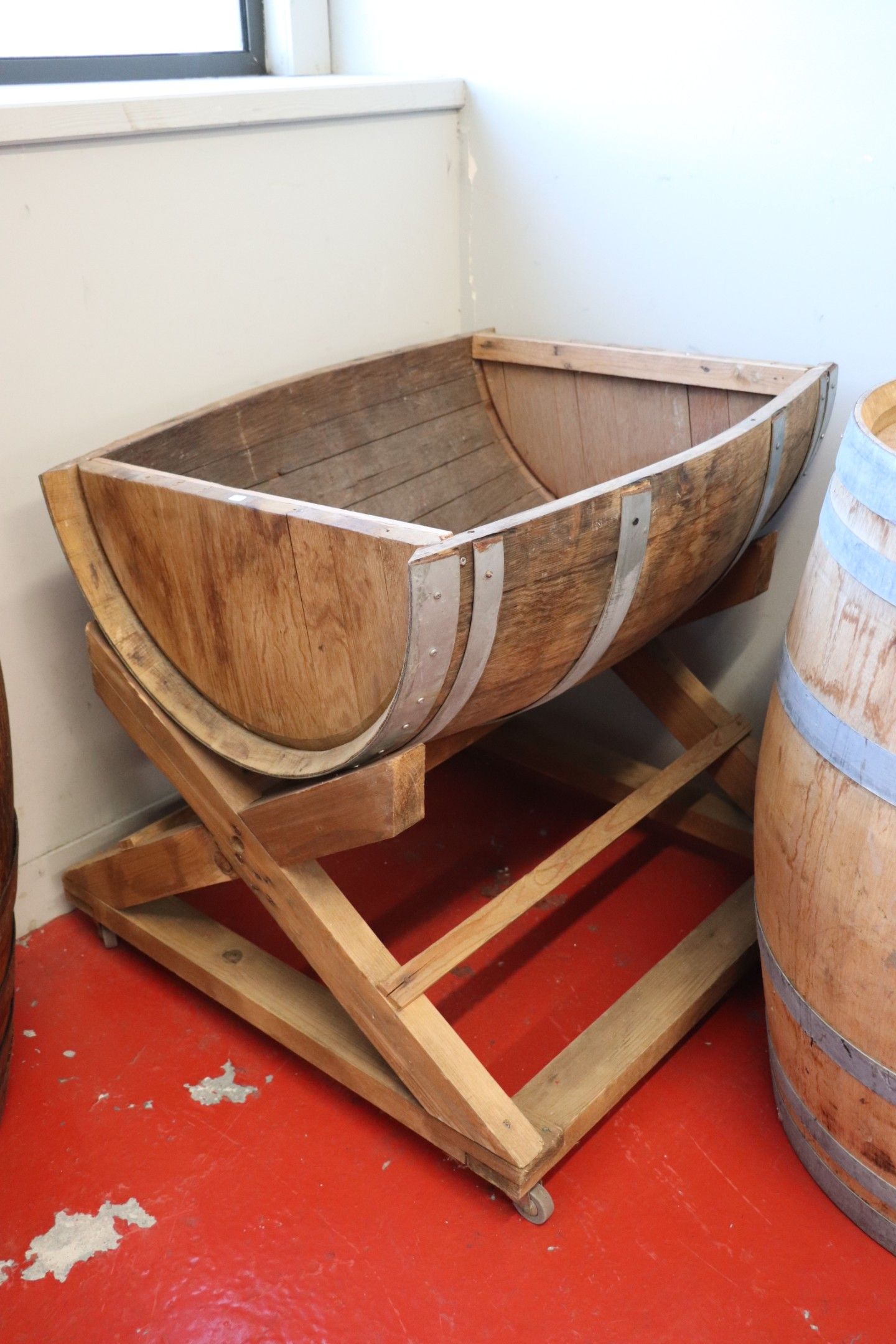 Half barrel on wheels. Size: 89x82x69 cm
