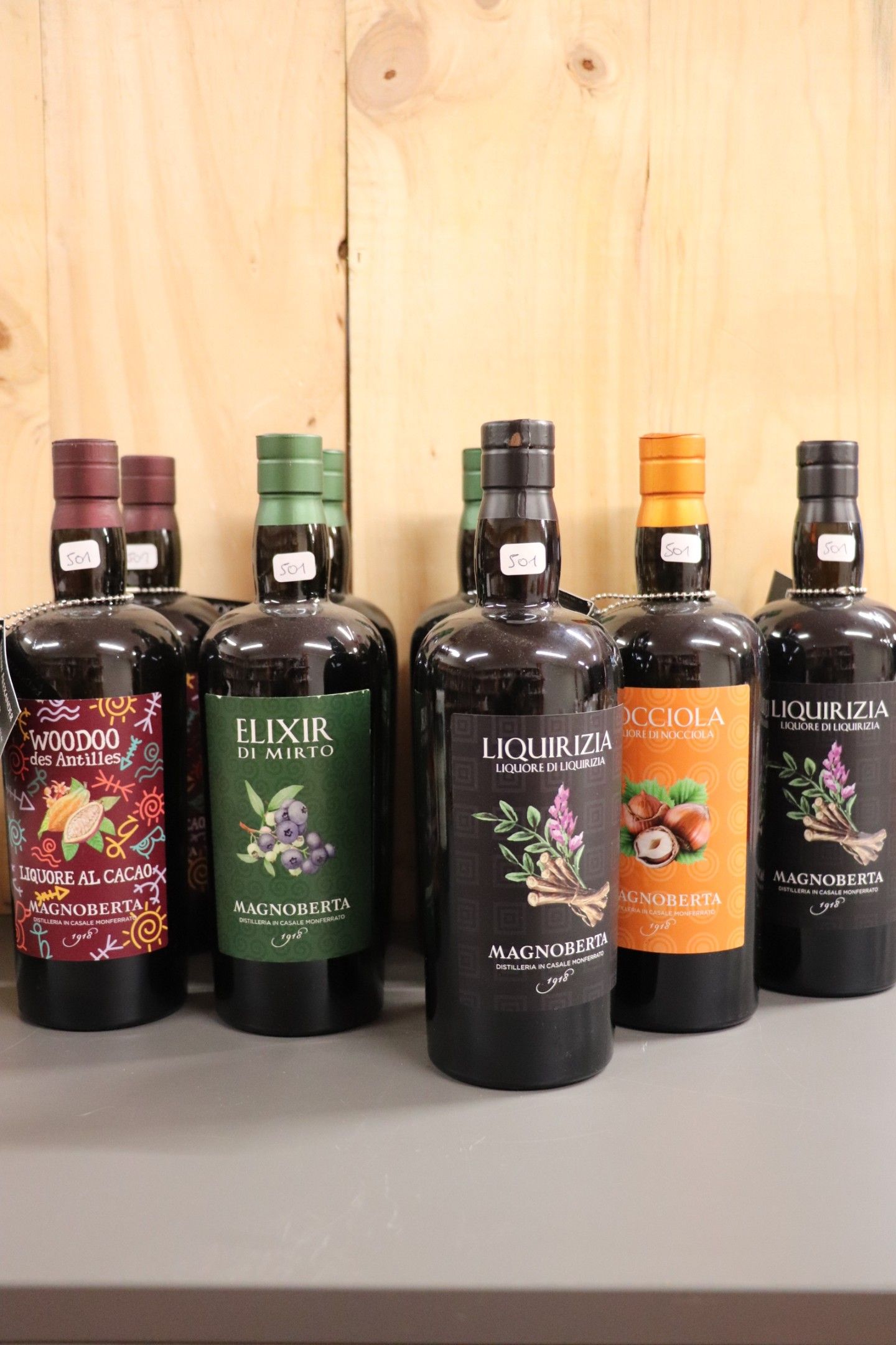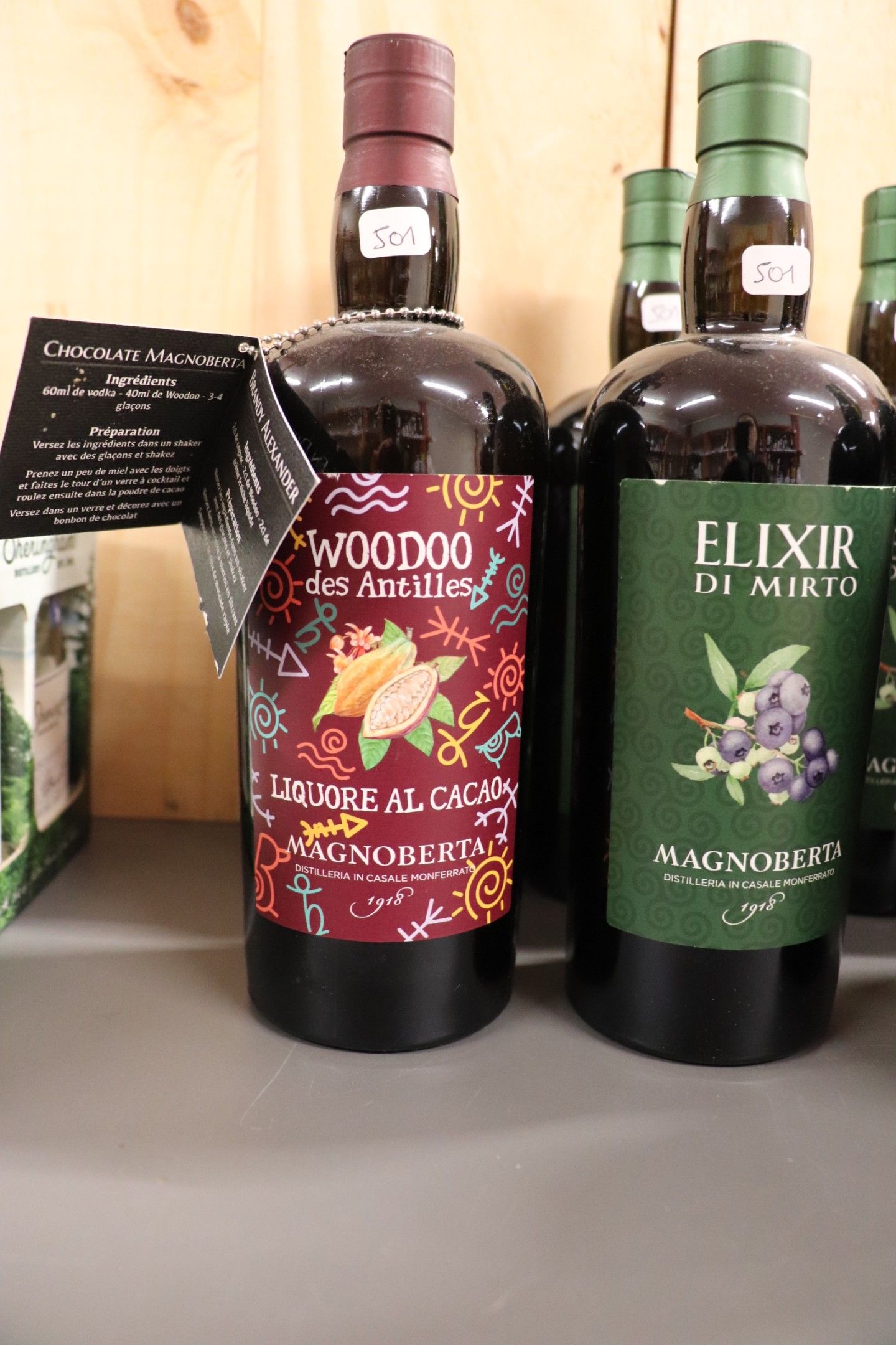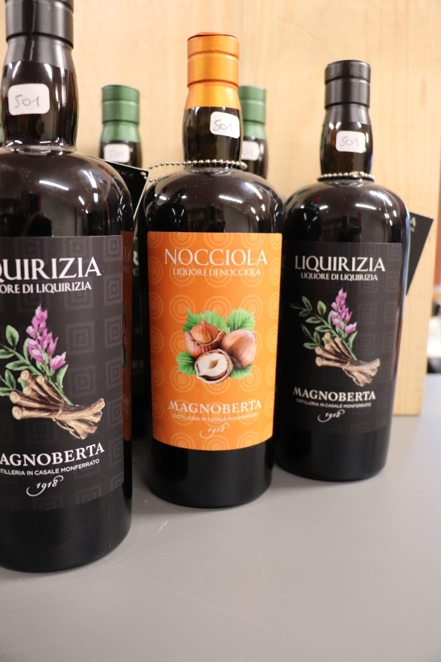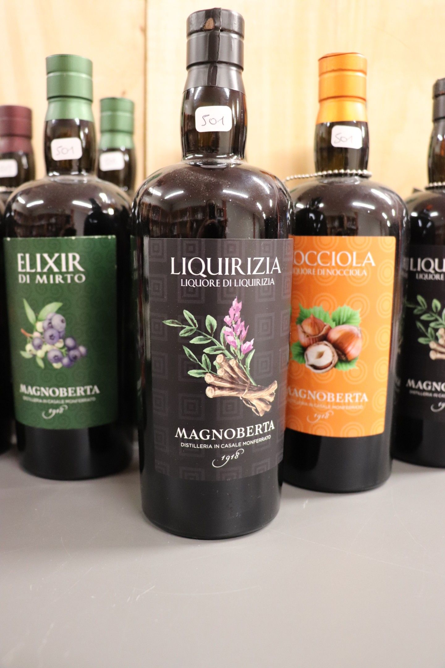 Batch of 9 bt of MAGNOBERTA liqueur including 4 Myrtle liqueur, 2 liquorice liqueur, 2 Cocoa liqueur and 1 Hazelnut liqueur.