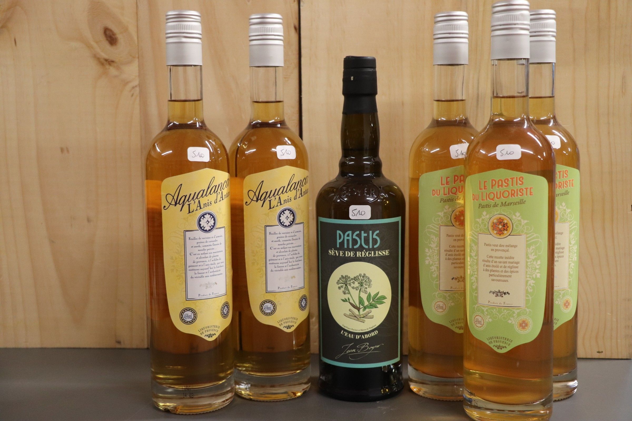 Batch of 6 bt including 3 pastis de Marseille, 2 l'anis d'antan and 1 pastis sève de réglisse