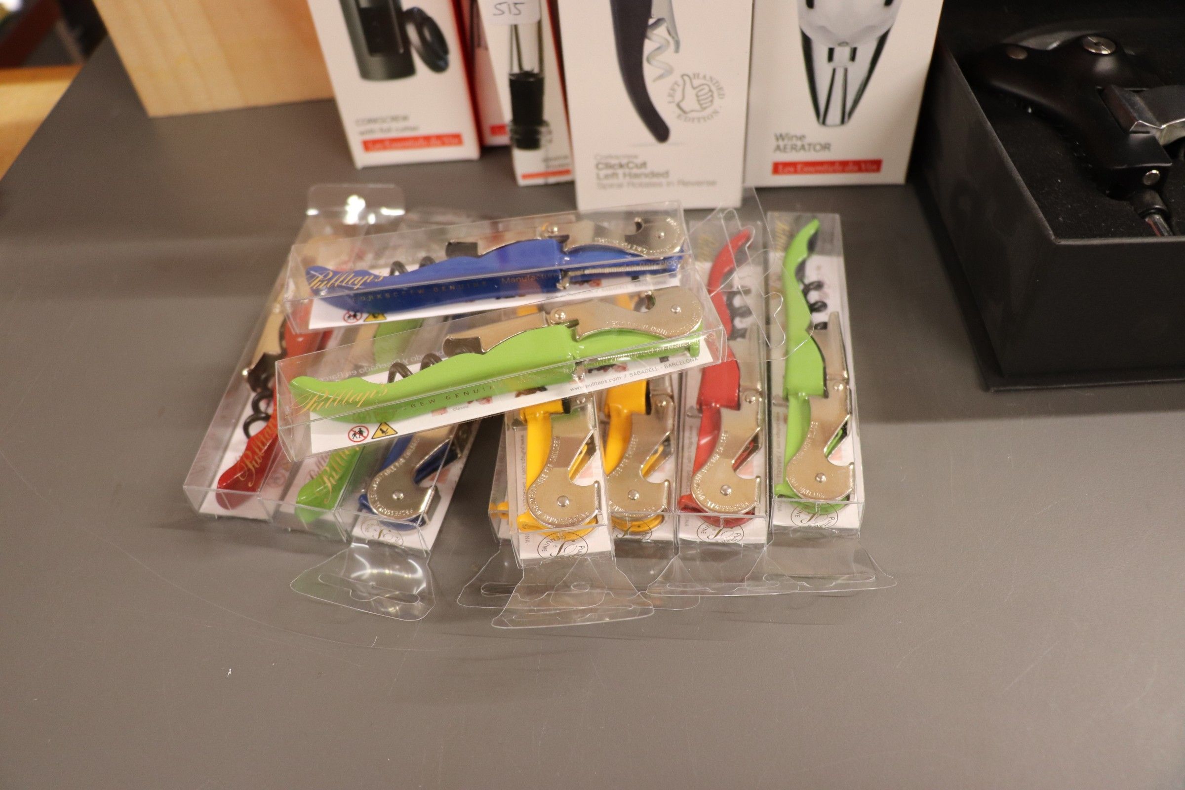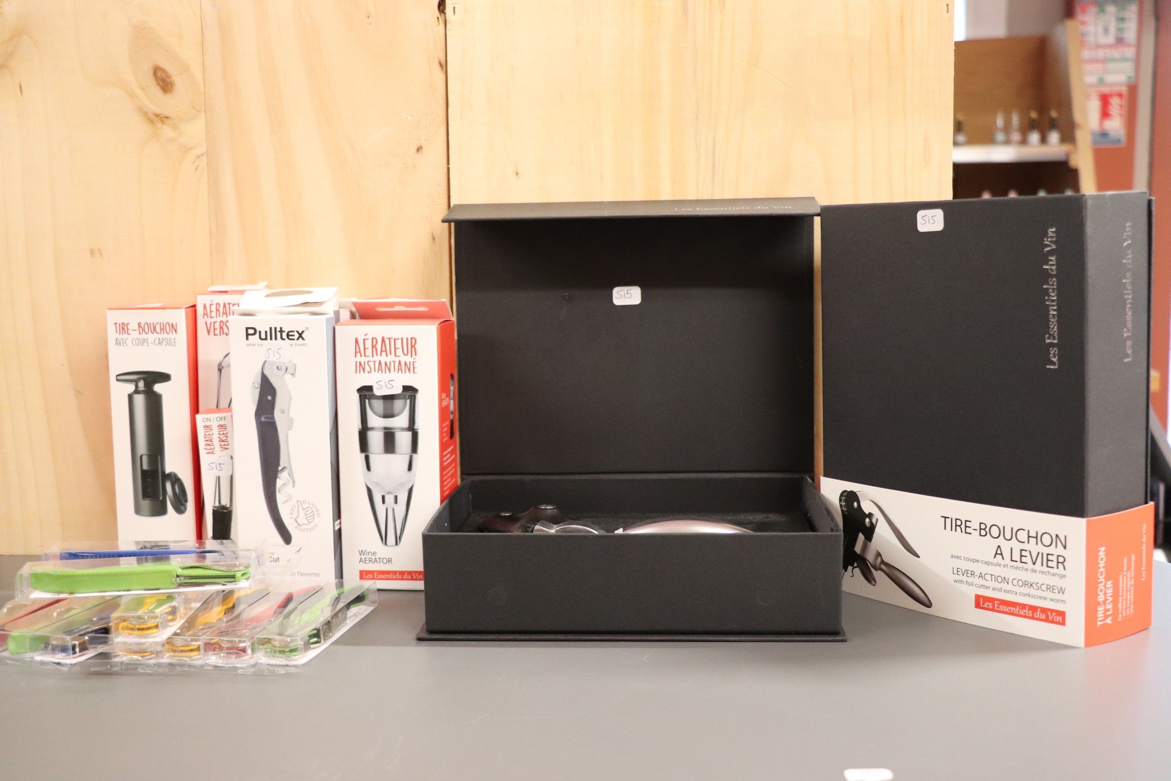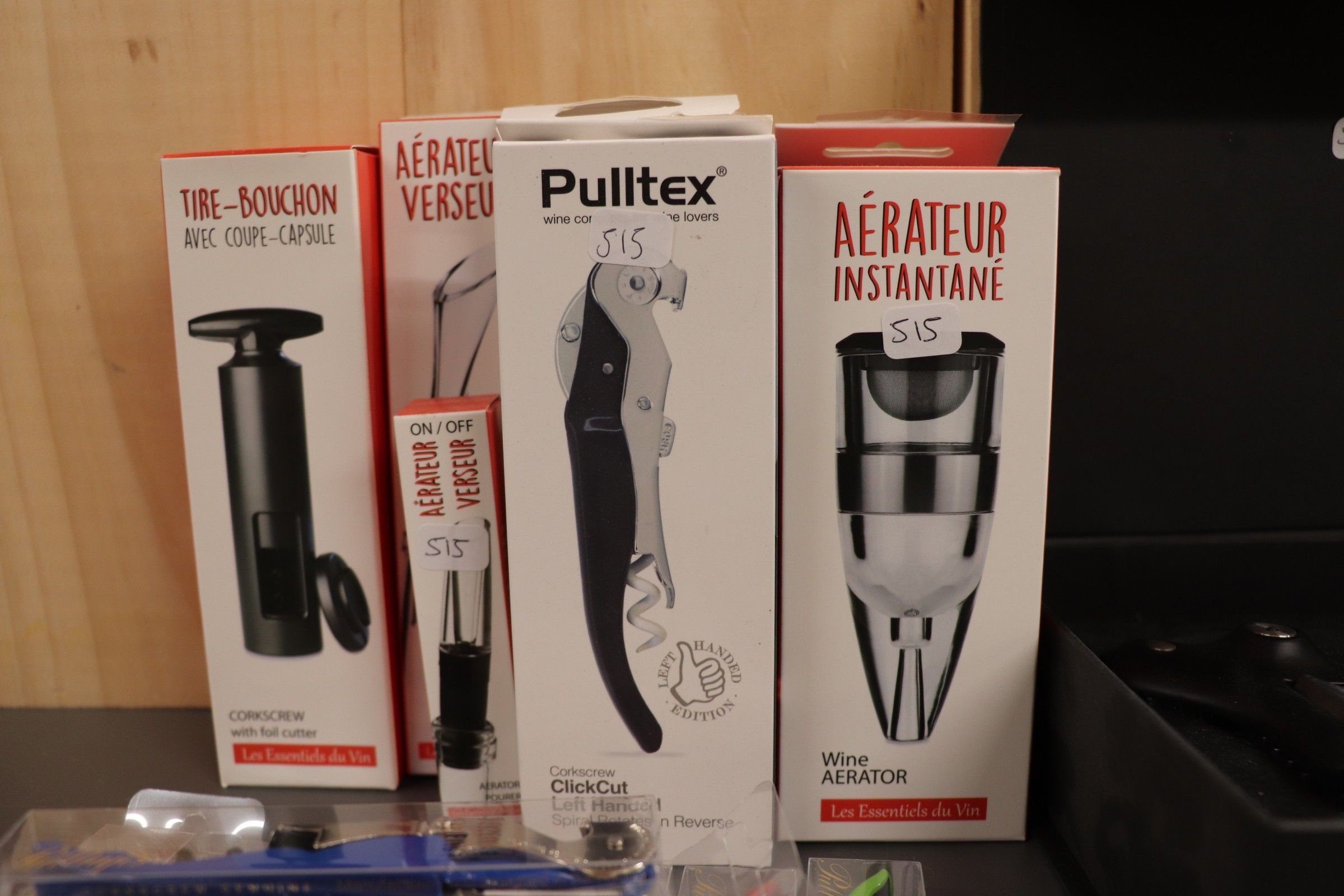 Set of accessories including 10 PULLTAP'S corkscrews, 2 lever corkscrews with cap cutter and spare wicks, 1 corkscrew with cap cutter, 4 PULLTEX corkscrews, 1 on/off pouring aerator, 1 pouring aerator.