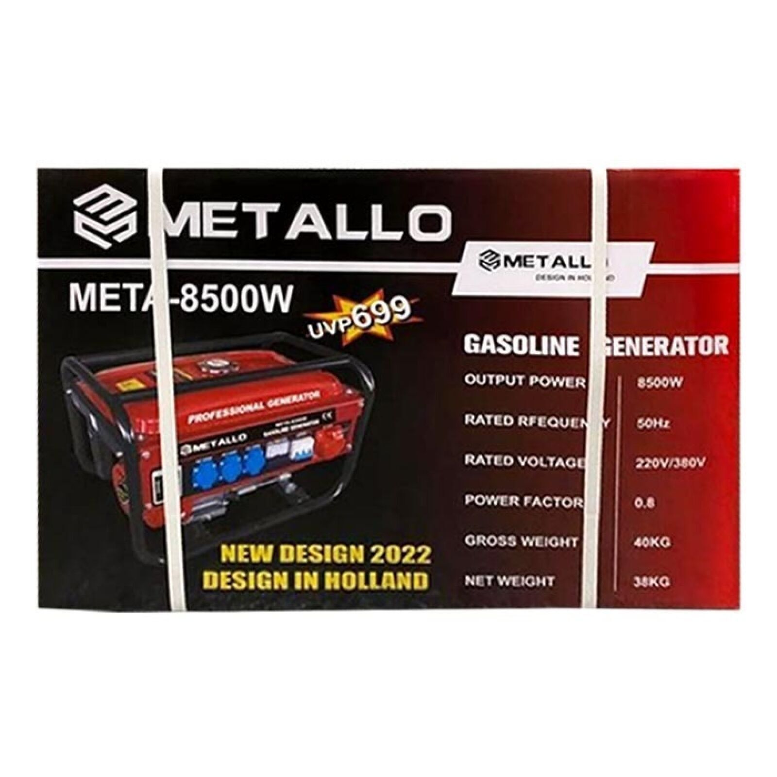 5526-1274 / Metallo Meta-8500W generator - 4-stroke petrol generator - Maximum power: 7 HP - 3 x 230 V sockets with voltmeter showing current voltage - 1 x 380 V and 1 x 12 V - 15 L tank with level indicator for continuous operation - AVR function for stable power output 220 V / 380 V 50/60 Hz - Net weight: 40 kg Tank capacity: 38 kg. - Capacity: 15 l - Anti-vibration feet - Fuel: petrol - Starting system: cable - Rated frequency: 50 Hz - Rated voltage: 12 V/230 V/380 V - Gross weight: 40 kg - Net weight: 38 kg - Engine type: single-cylinder 4-stroke - Tank capacity: 15 l - Fuel consumption: approx. 1.3 l - Red colour /// LIKE NEW