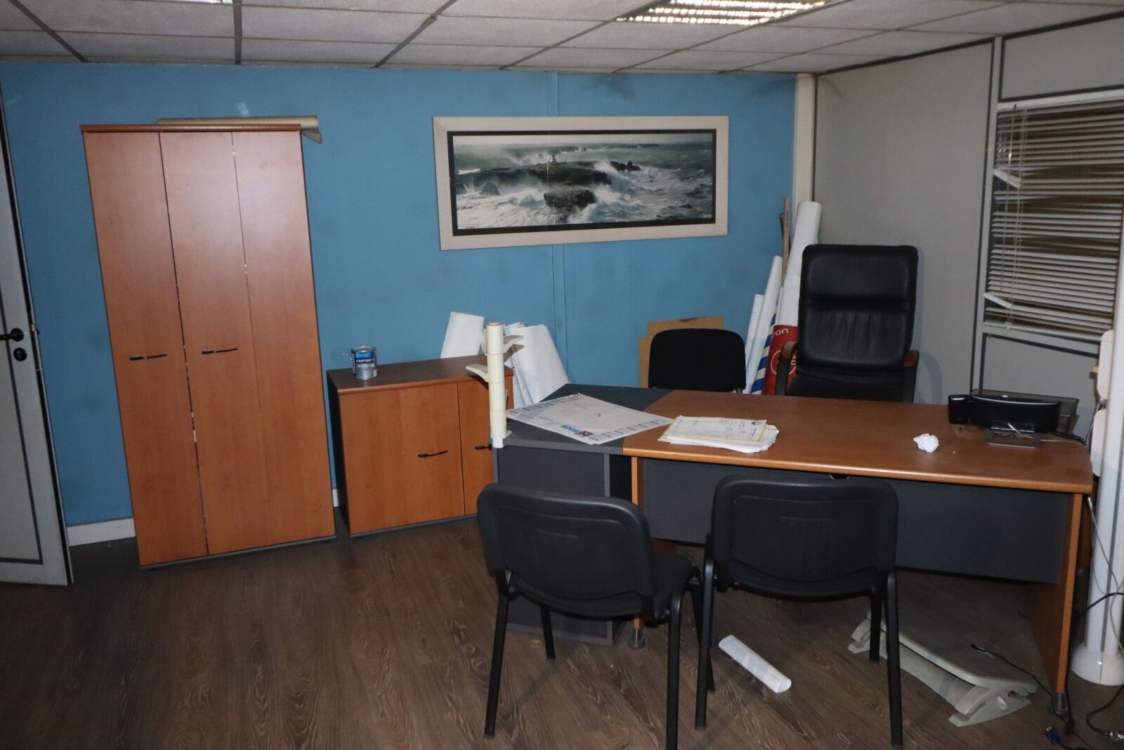 Three desks (two with returns, one straight), one round table, three two-door cupboards, two niches, four base units, three office armchairs, six chairs