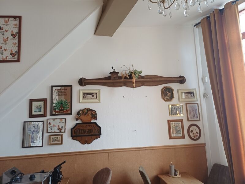 Eight light green fabric chairs, a two-seater sofa, a wooden chair (old, worn), two wooden tables, a round wooden table, a set of picture frames.
