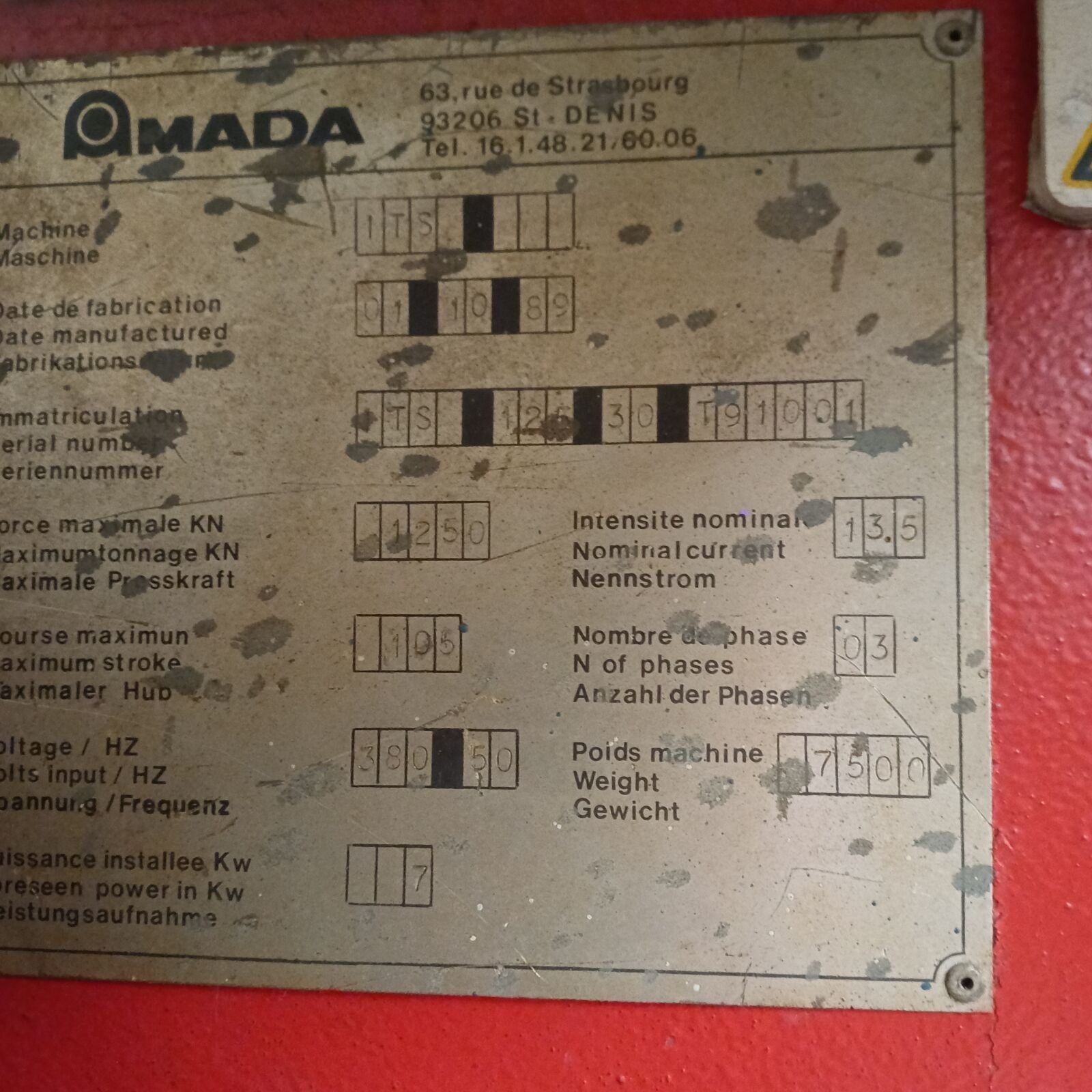on the AMADA plate, dated 01/10/1989