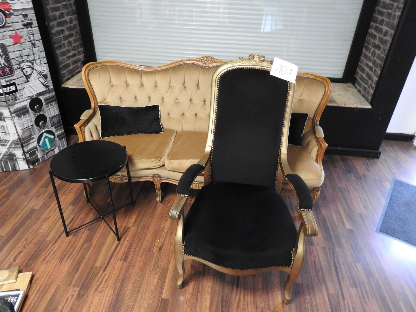 1 3-seater sofa in brown fabric + 1 single sofa in black fabric + a black metal pedestal table