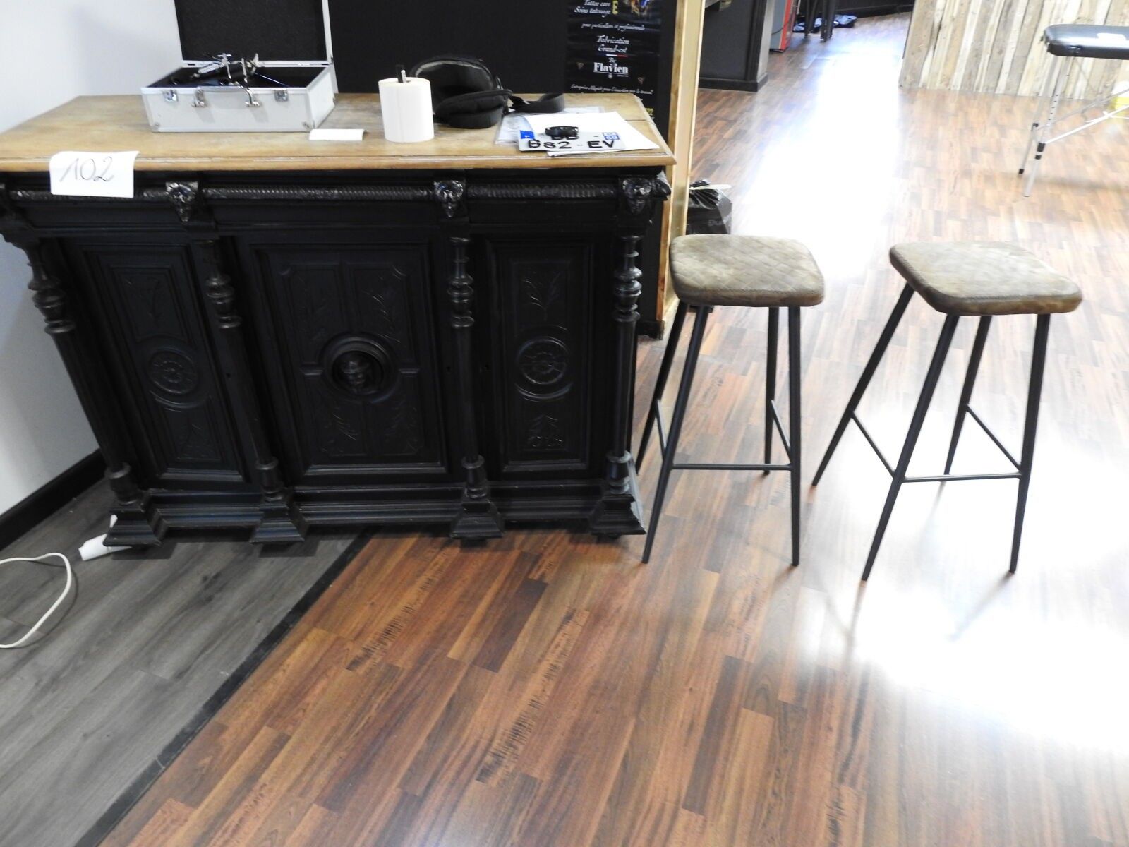 1 black wooden counter with 2 brown metal-framed fabric stools