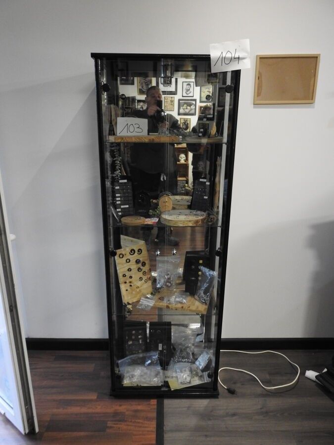 2 wood and glass display cabinets, 4 levels, integrated display lighting - one door missing