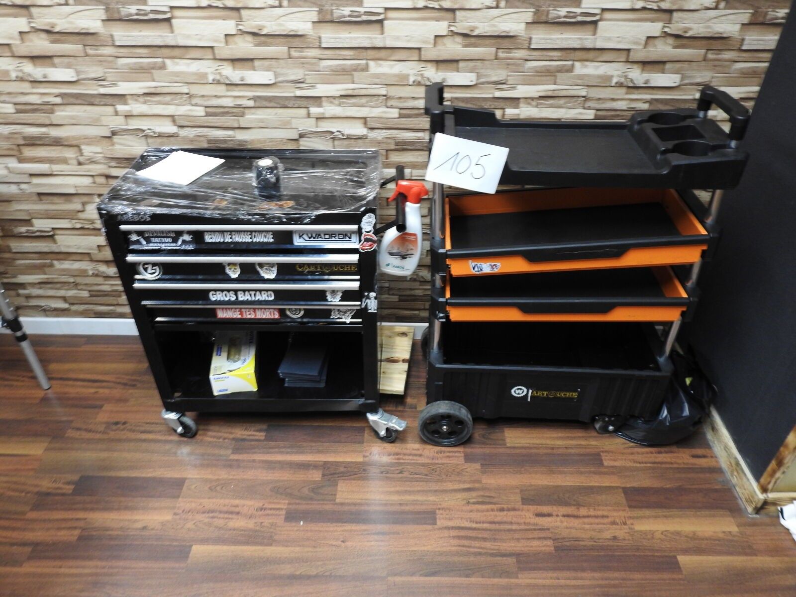 1 black metal AREBOS trolley on castors + 1 plastic and metal trolley on castors CARTOUCHE