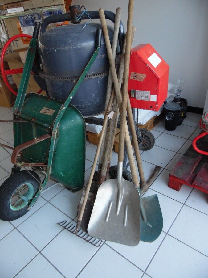 Wheelbarrow, electric concrete mixer, set of shovels - located 24b avenue d'Antioche 17480 LE CHATEAU D'OLERON - visit on 19/11 from 9am to 9.30am - collection on 25 at 9am
